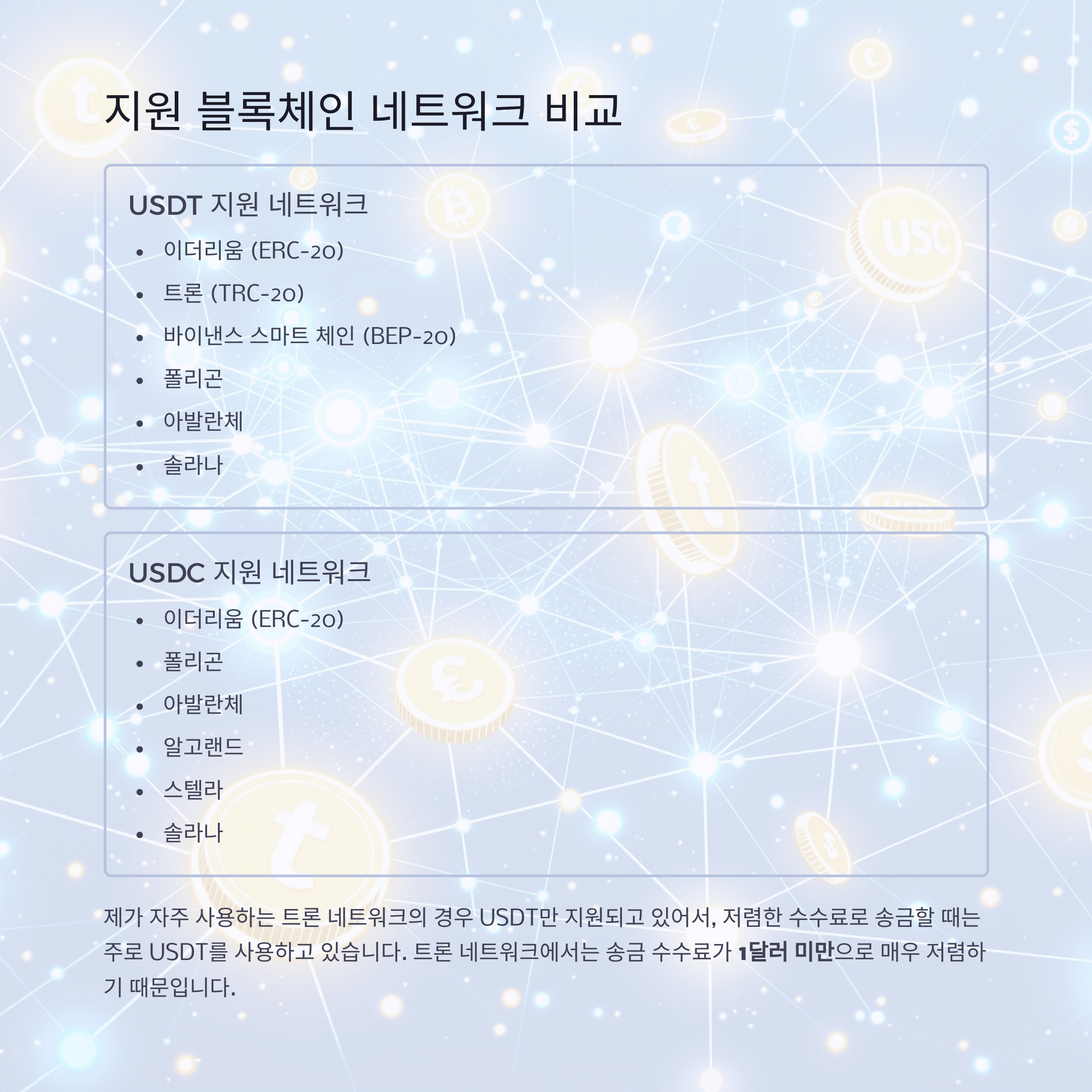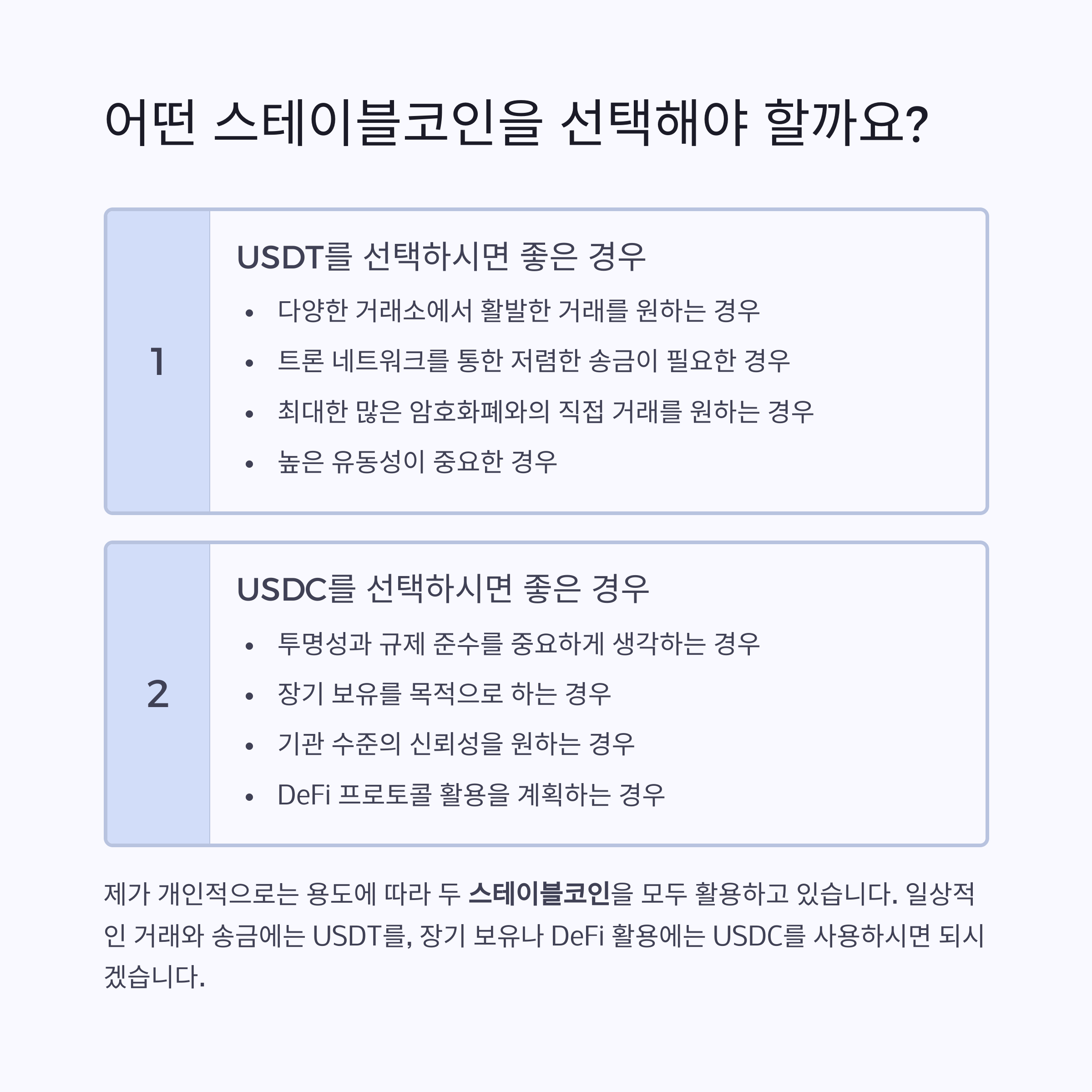 제가 개인적으로는 용도에 따라 두 스테이블코인을 모두 활용하고 있습니다. 일상적인 거래와 송금에는 USDT를, 장기 보유나 DeFi 활용에는 USDC를 사용하시면 되시겠습니다.