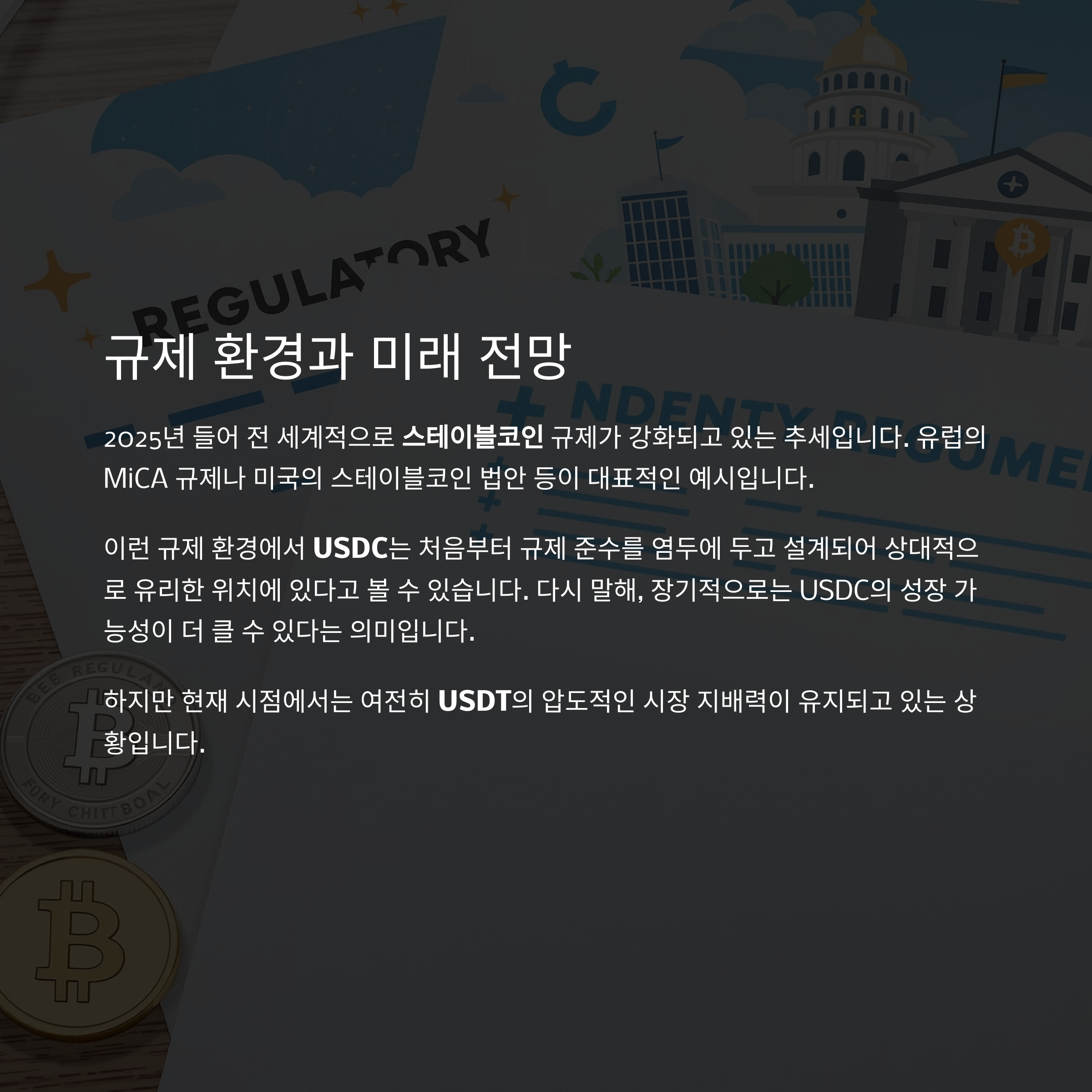 이런 규제 환경에서 USDC는 처음부터 규제 준수를 염두에 두고 설계되어 상대적으로 유리한 위치에 있다고 볼 수 있습니다. 다시 말해, 장기적으로는 USDC의 성장 가능성이 더 클 수 있다는 의미입니다.