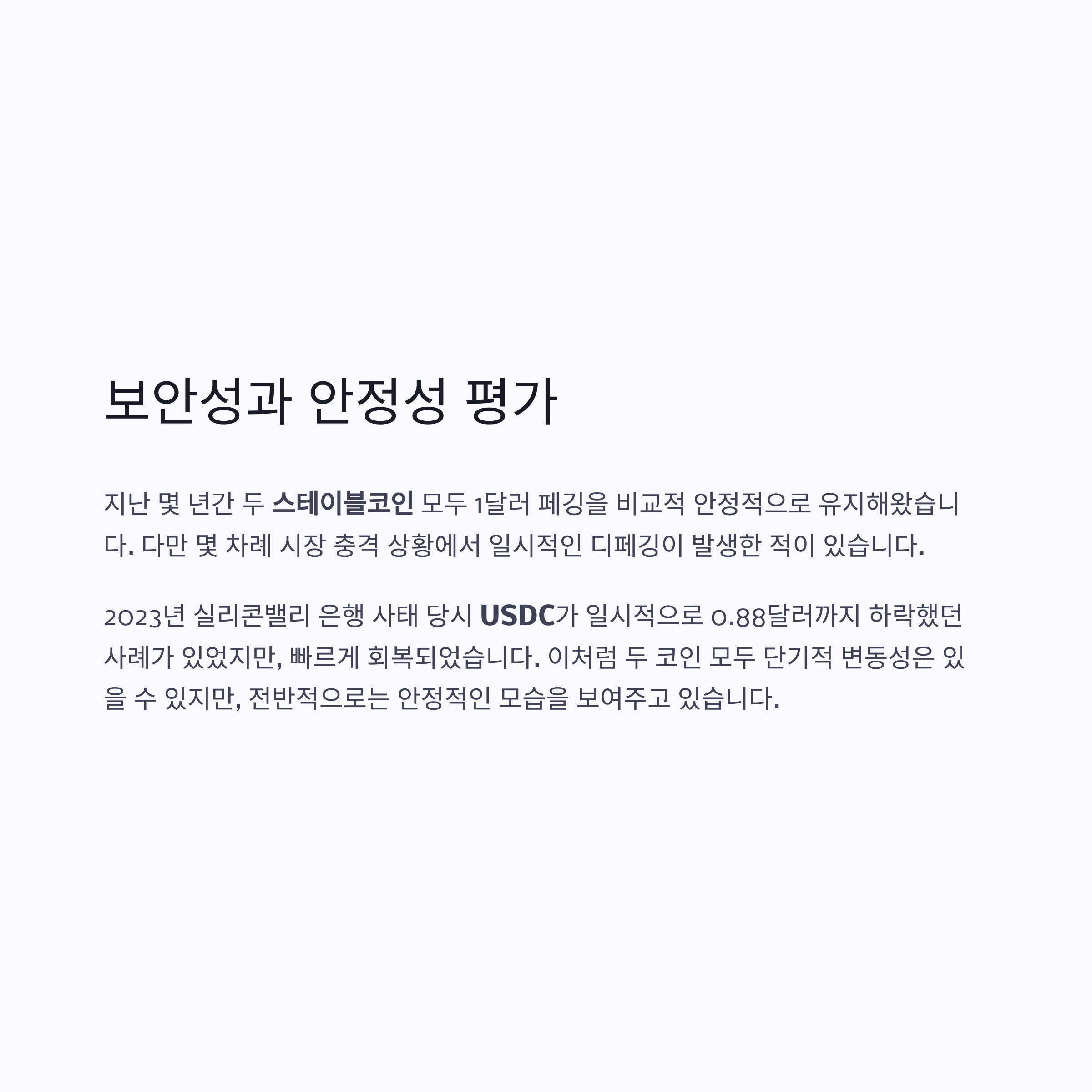 2023년 실리콘밸리 은행 사태 당시 USDC가 일시적으로 0.88달러까지 하락했던 사례가 있었지만, 빠르게 회복되었습니다. 이처럼 두 코인 모두 단기적 변동성은 있을 수 있지만, 전반적으로는 안정적인 모습을 보여주고 있습니다.