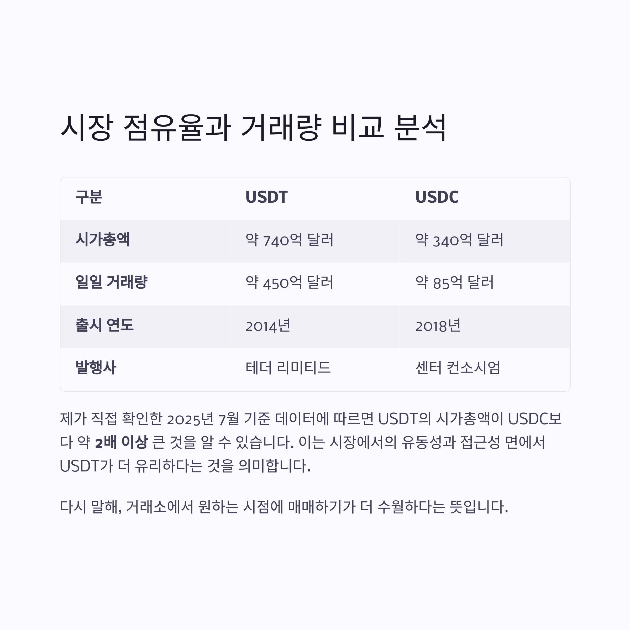 제가 직접 확인한 2025년 7월 기준 데이터에 따르면 USDT의 시가총액이 USDC보다 약 2배 이상 큰 것을 알 수 있습니다. 이는 시장에서의 유동성과 접근성 면에서 USDT가 더 유리하다는 것을 의미합니다.
