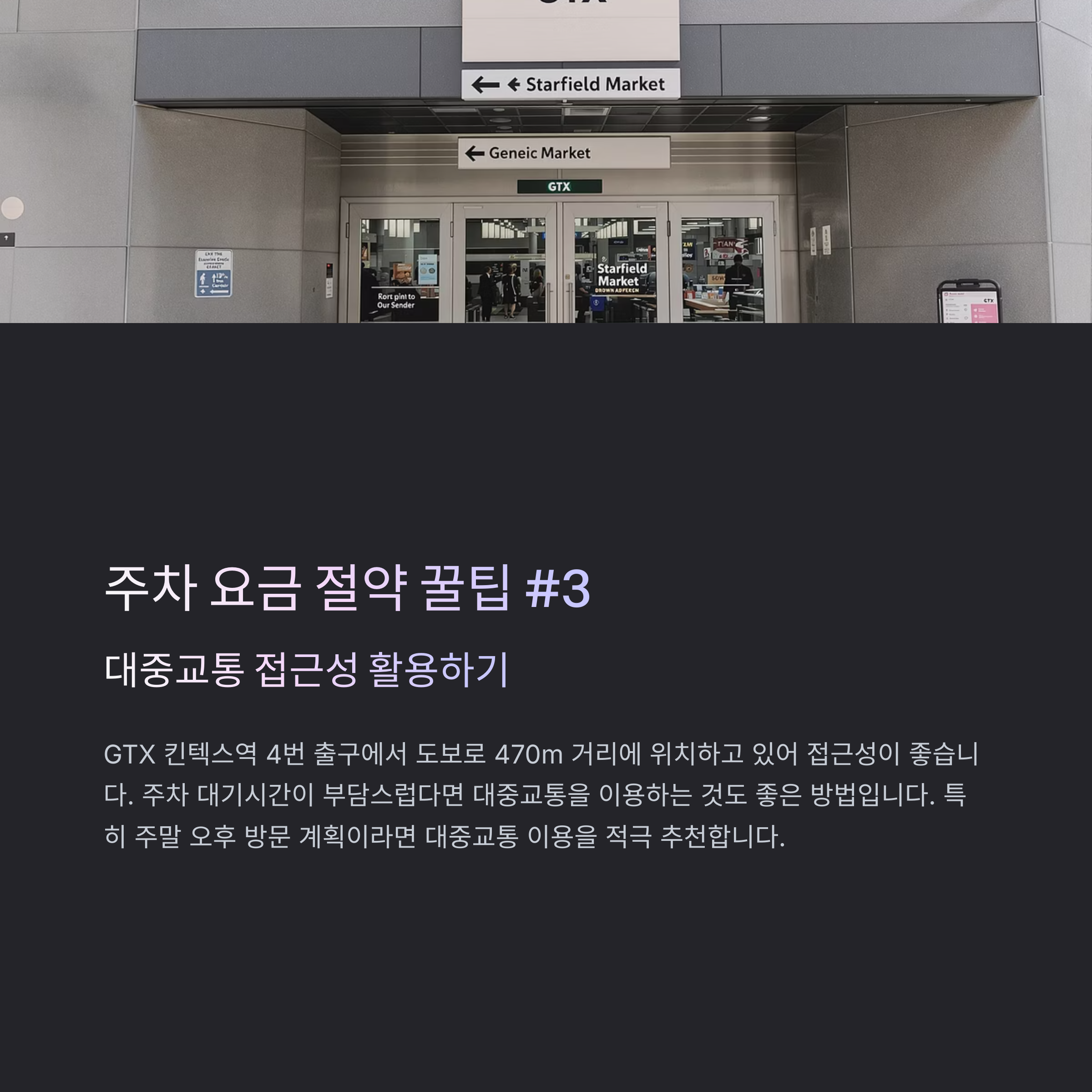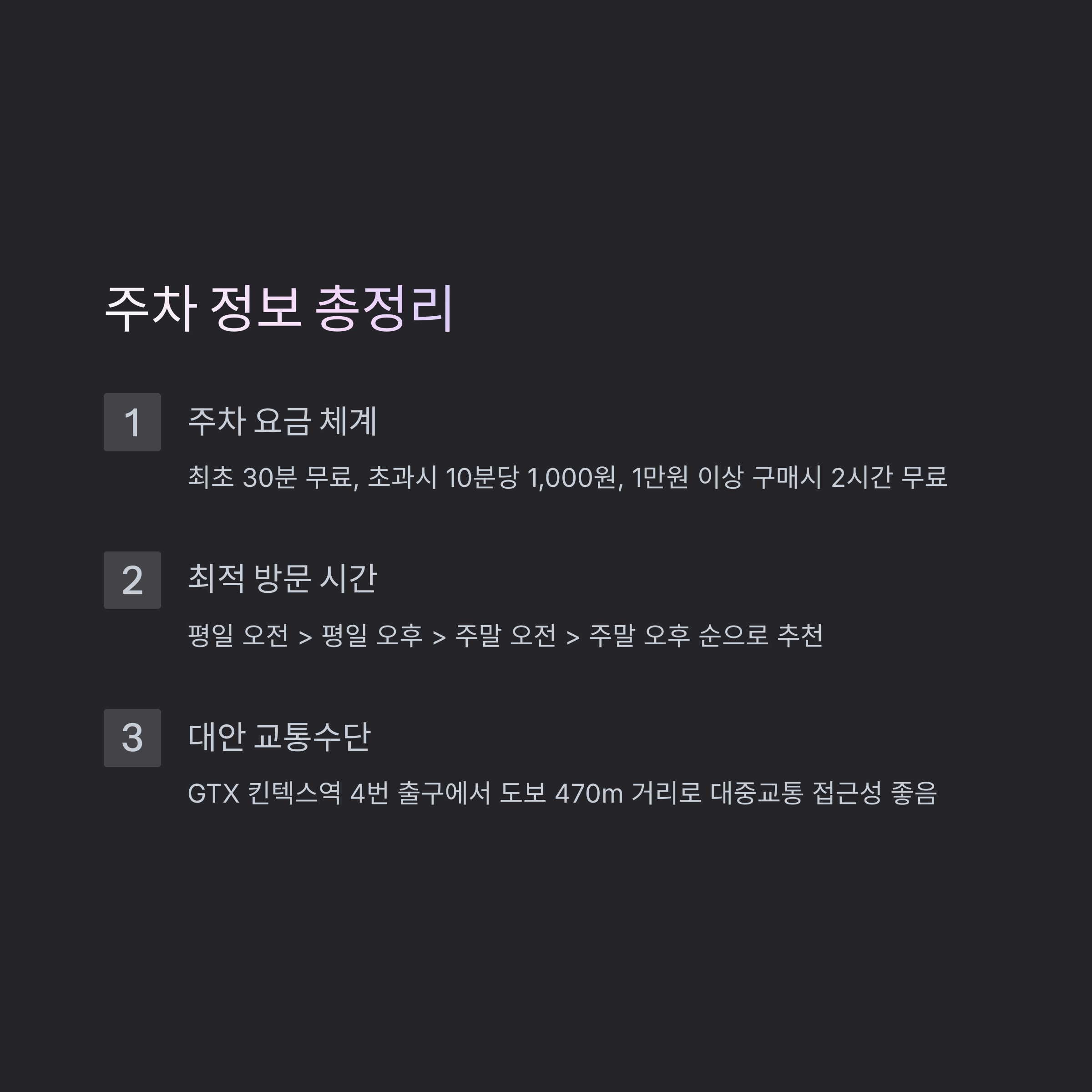 평일 오전 시간대를 이용하거나, 주말 방문 시에는 충분한 시간 여유를 두고 계획하시면 됩니다. 또한 GTX 킨텍스역에서 도보 470m 거리에 있어 대중교통 이용도 고려해볼 만합니다.