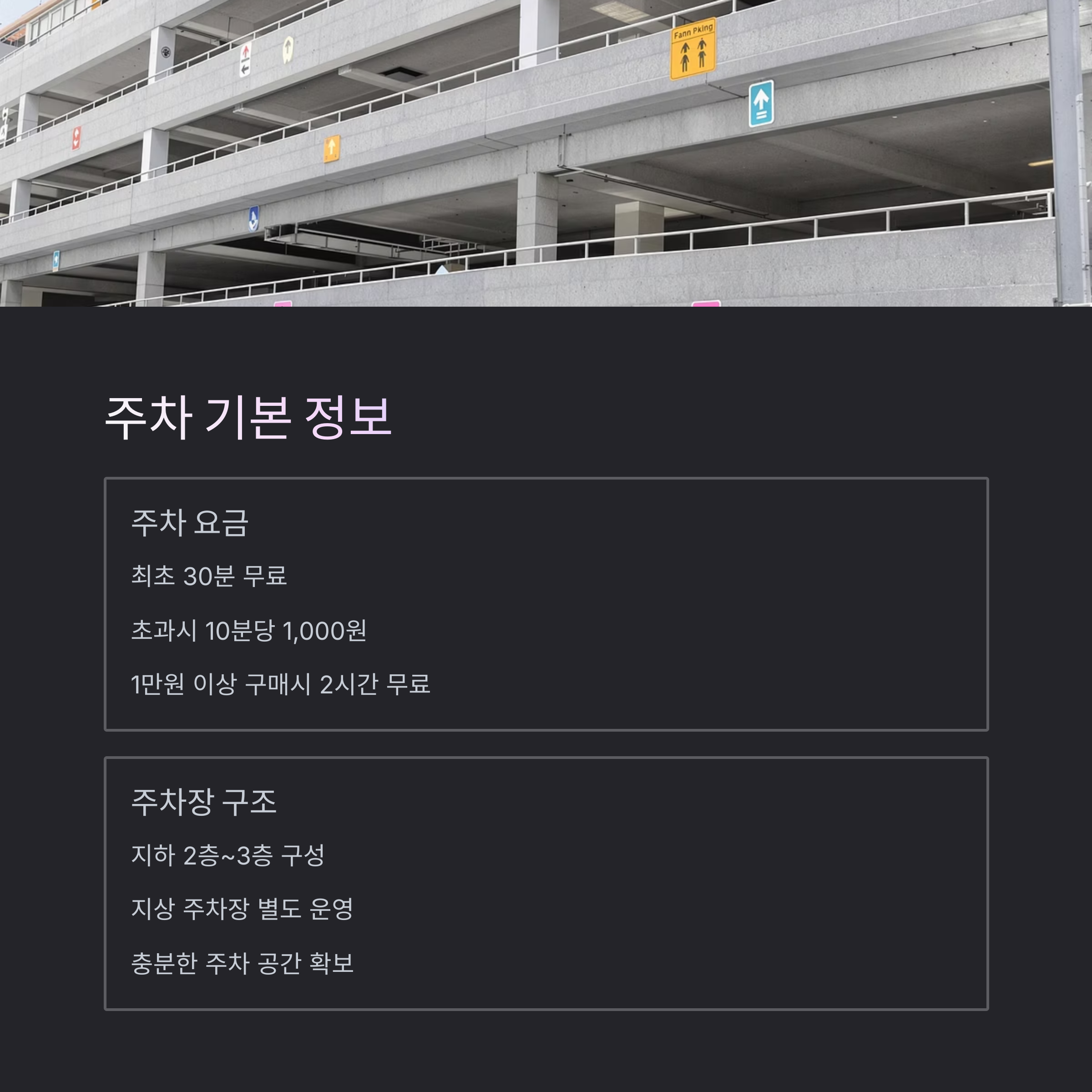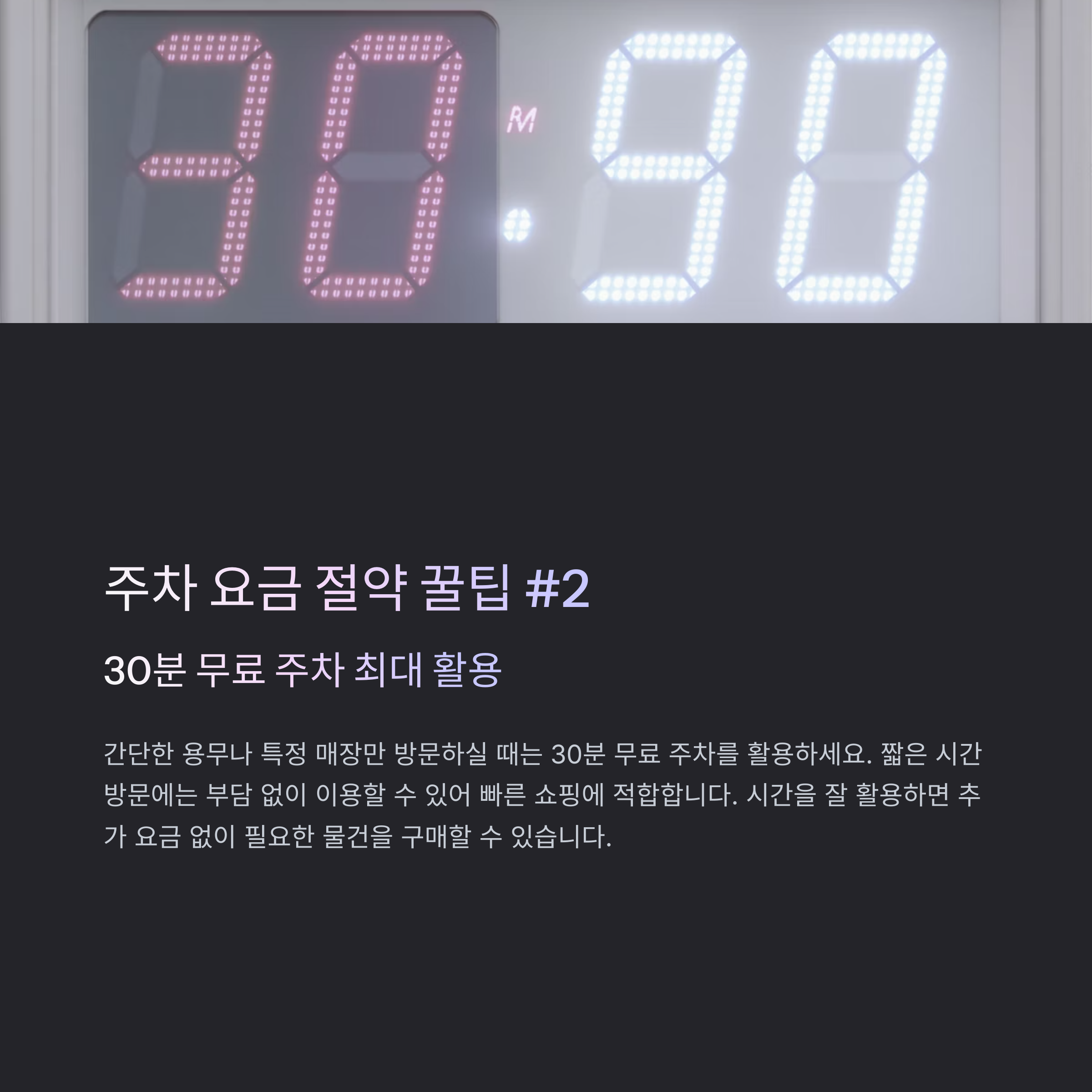 간단한 용무나 특정 매장만 방문하실 때는 30분 무료 주차를 활용하시면 됩니다. 이처럼 짧은 시간 방문에는 부담 없이 이용하실 수 있습니다