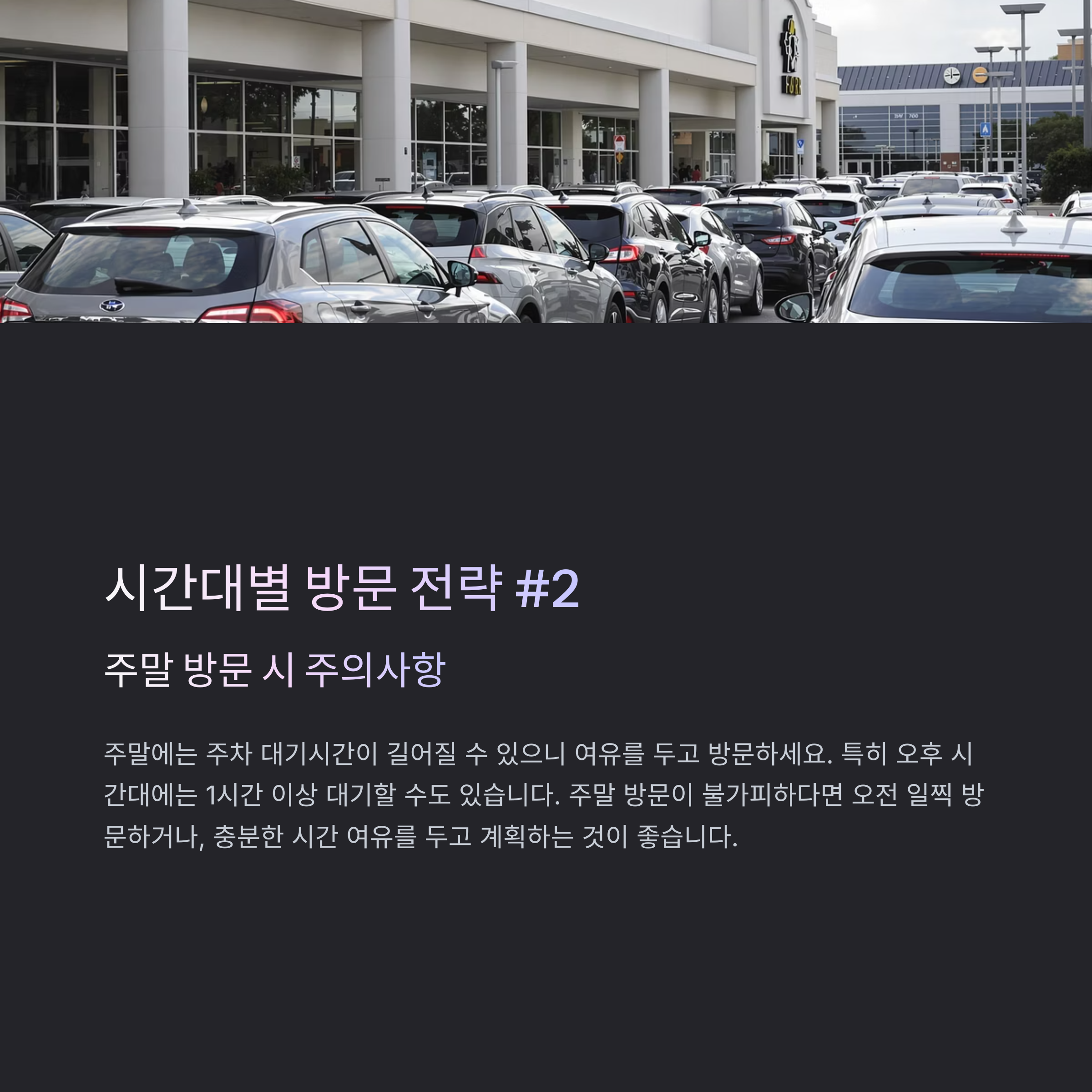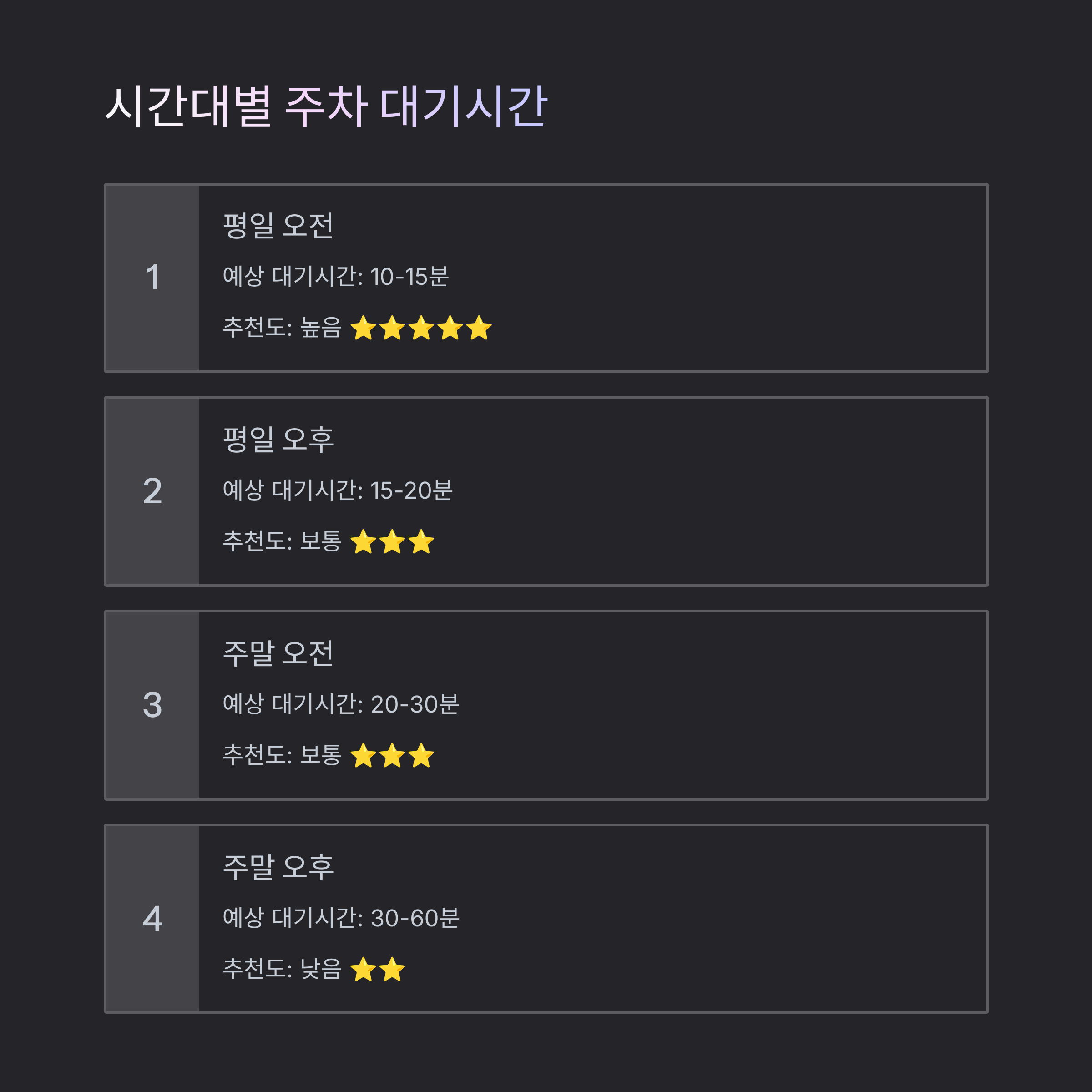 평일 오전 시간대를 이용하거나, 주말이라면 오전 일찍 방문하시는 것을 추천드립니다. 하지만 꼭 주말 오후에 방문해야 한다면 충분한 시간 여유를 두고 계획하시기 바랍니다.