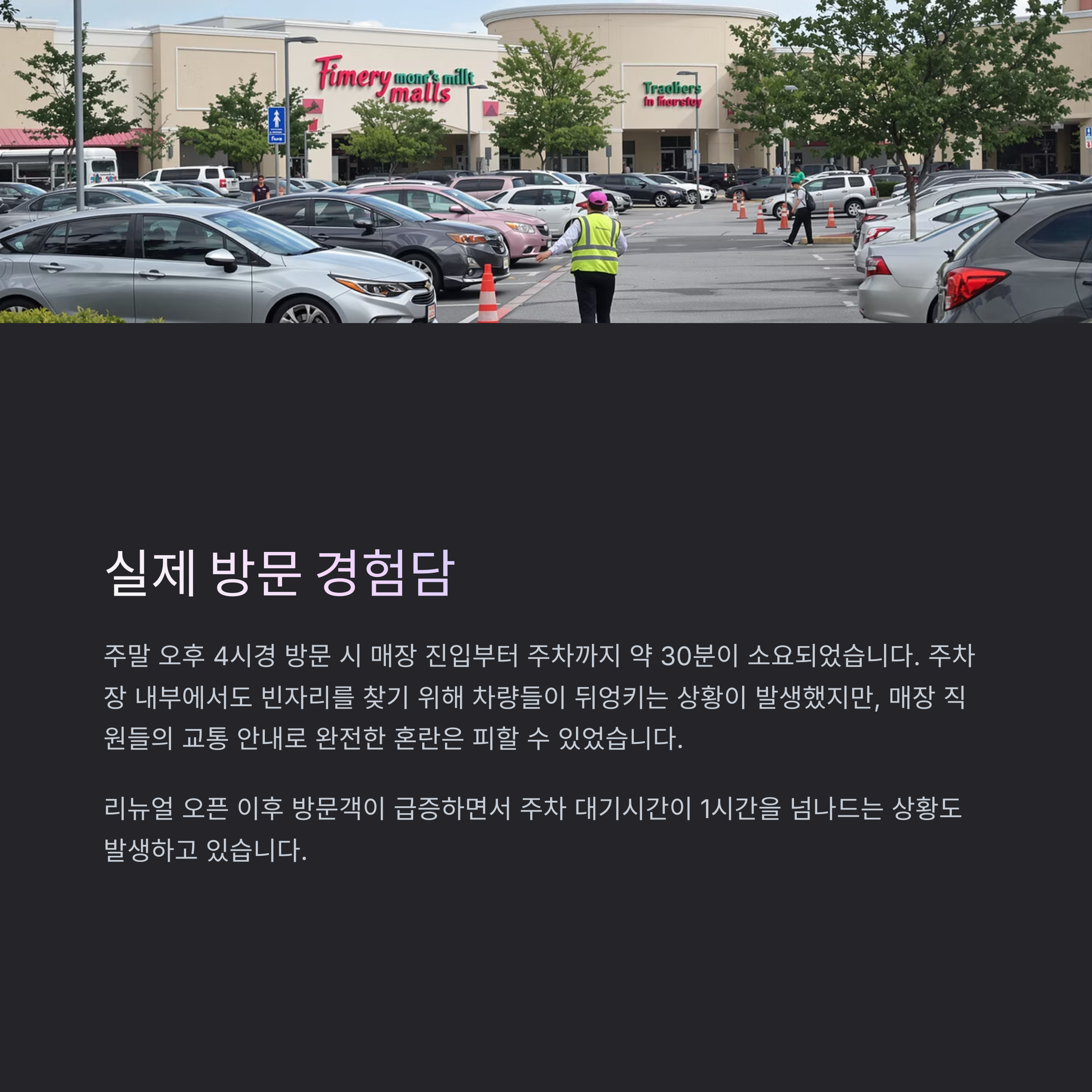 리뉴얼 오픈 이후 매출이 117% 증가했다고 합니다. 이는 방문객 수의 급증을 의미하며, 자연스럽게 주차 대기시간도 늘어나고 있는 상황입니다.