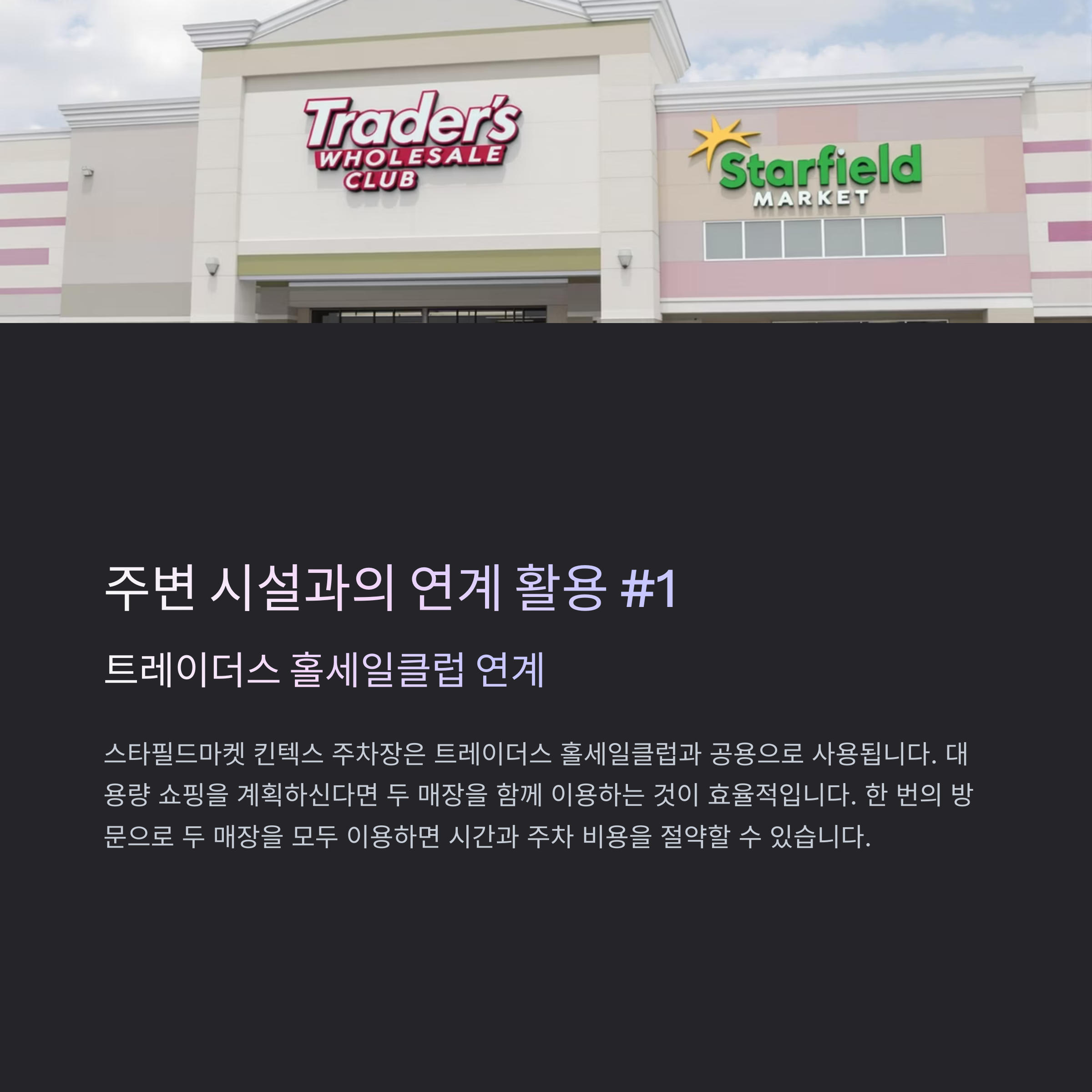 스타필드마켓 킨텍스 주차장은 트레이더스 홀세일클럽과 공용으로 사용됩니다. 따라서 대용량 쇼핑을 계획하신다면 두 매장을 함께 이용하시는 것이 효율적입니다.