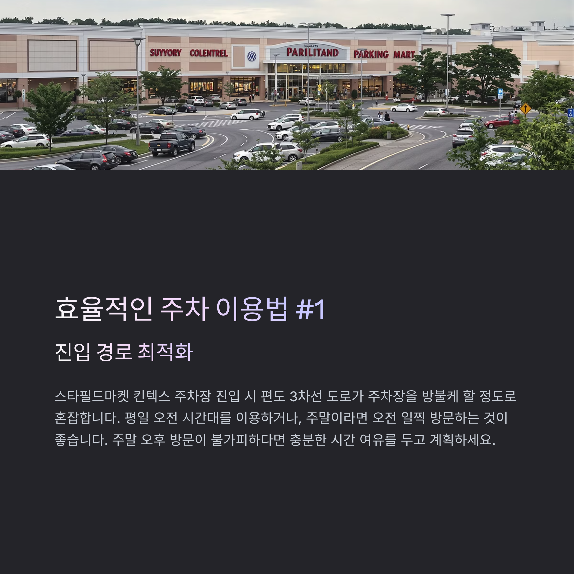 평일에는 주차 대기시간이 상대적으로 짧습니다. 특히 오전 시간대에는 여유롭게 스타필드마켓 킨텍스 주차를 이용하실 수 있습니다.