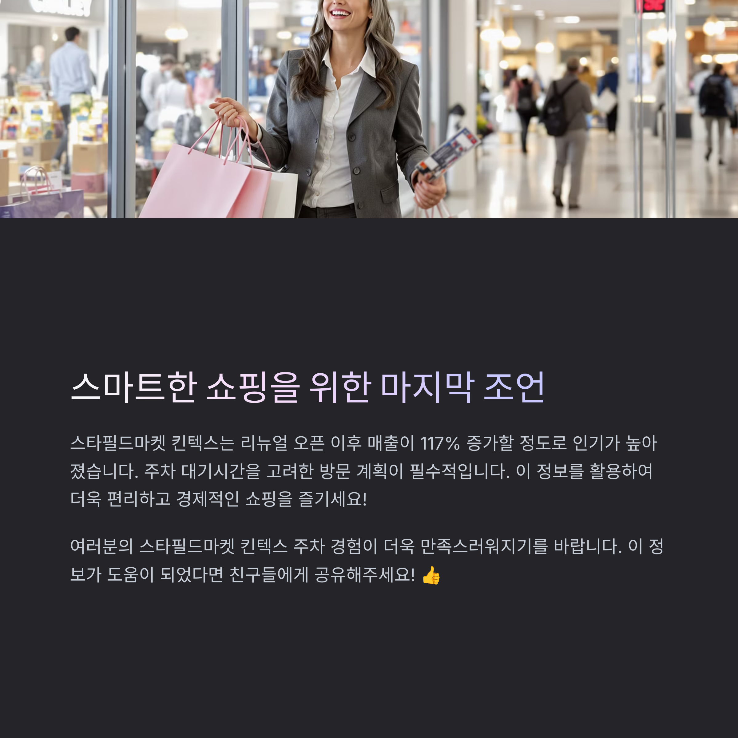 이처럼 사전 정보를 잘 활용하시면 더욱 편리하고 경제적인 쇼핑을 즐기실 수 있을 것입니다. 여러분의 스타필드마켓 킨텍스 주차 경험이 더욱 만족스러워지기를 바랍니다.