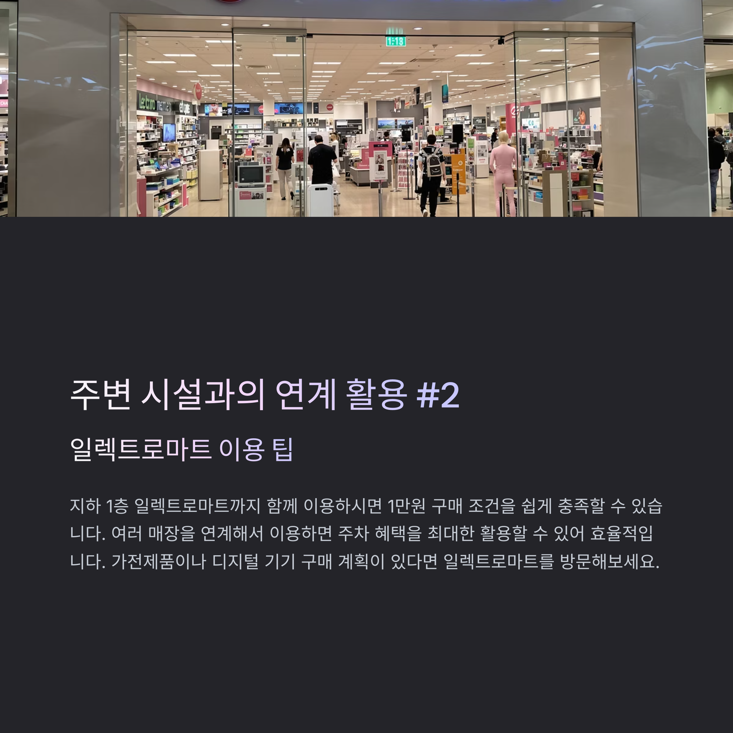 지하 1층 일렉트로마트까지 함께 이용하시면 1만원 구매 조건을 쉽게 충족할 수 있습니다7. 이처럼 여러 매장을 연계해서 이용하시면 주차 혜택을 최대한 활용하실 수 있습니다.