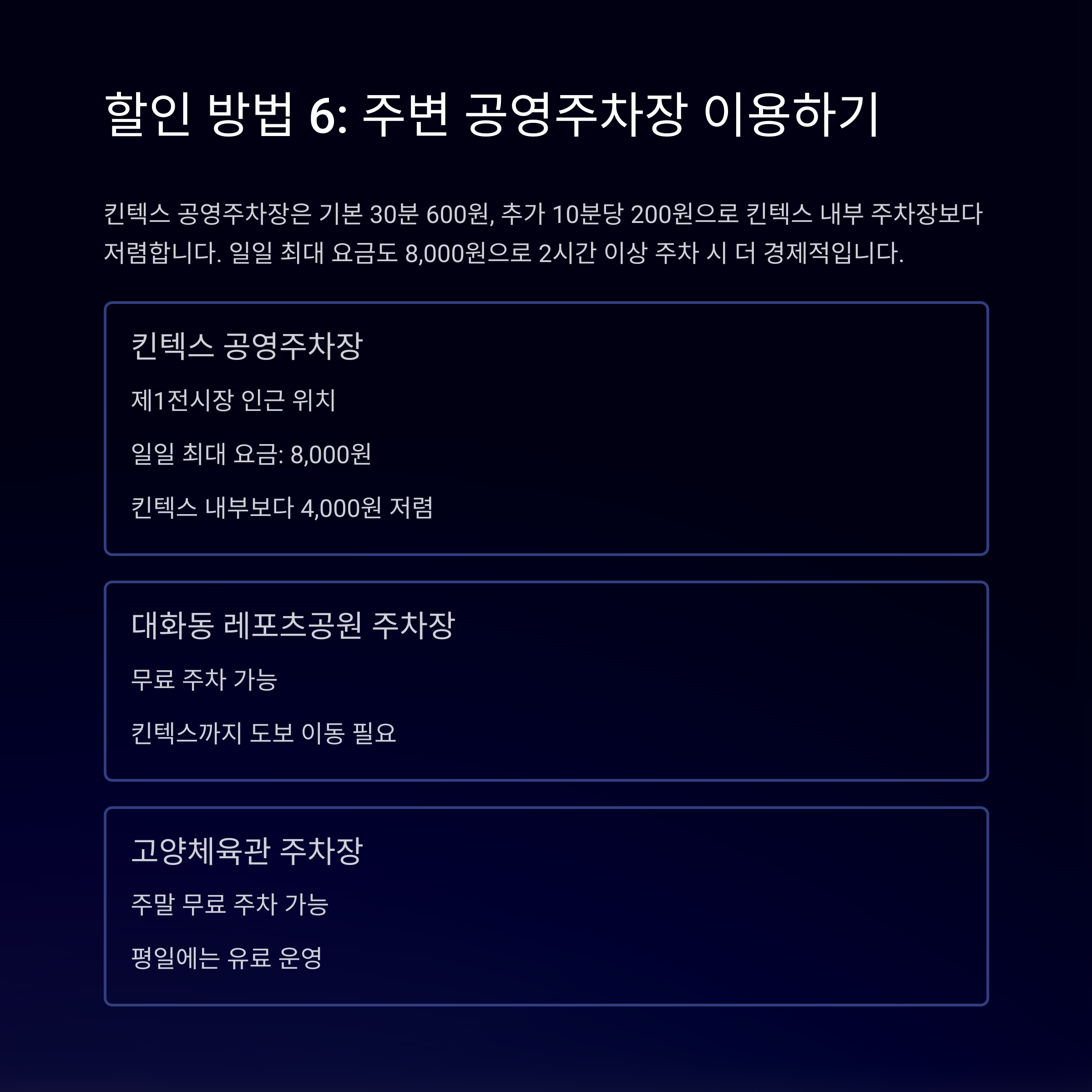 킨텍스 공영주차장은 기본 30분 600원, 추가 10분당 200원으로 킨텍스 내부 주차장보다 저렴합니다3. 일일 최대 요금도 8,000원으로 2시간 이상 주차 시 더 경제적입니다.