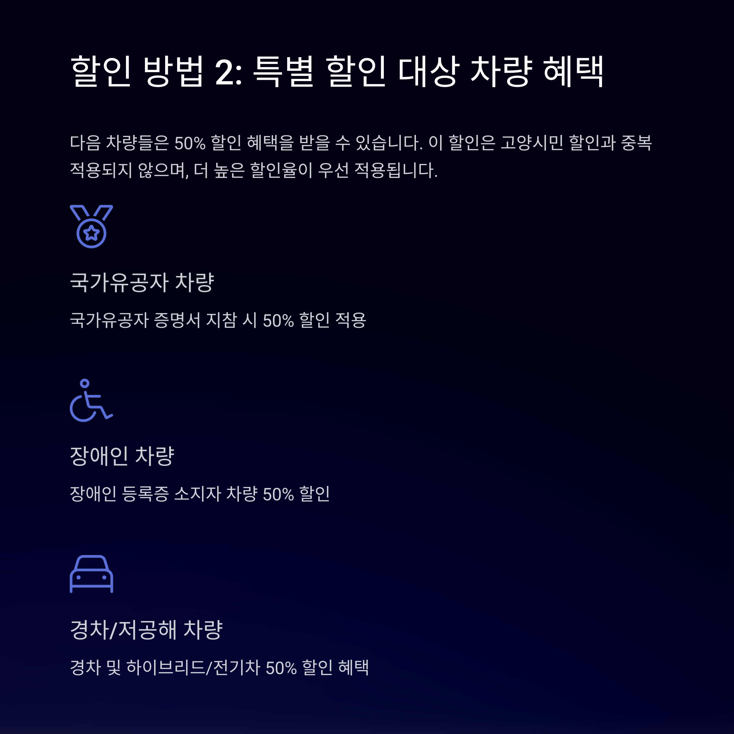 둘째, 특별 할인 대상 차량(국가유공자, 장애인, 경차, 저공해차량)은 50% 할인 혜택을 받을 수 있습니다.
