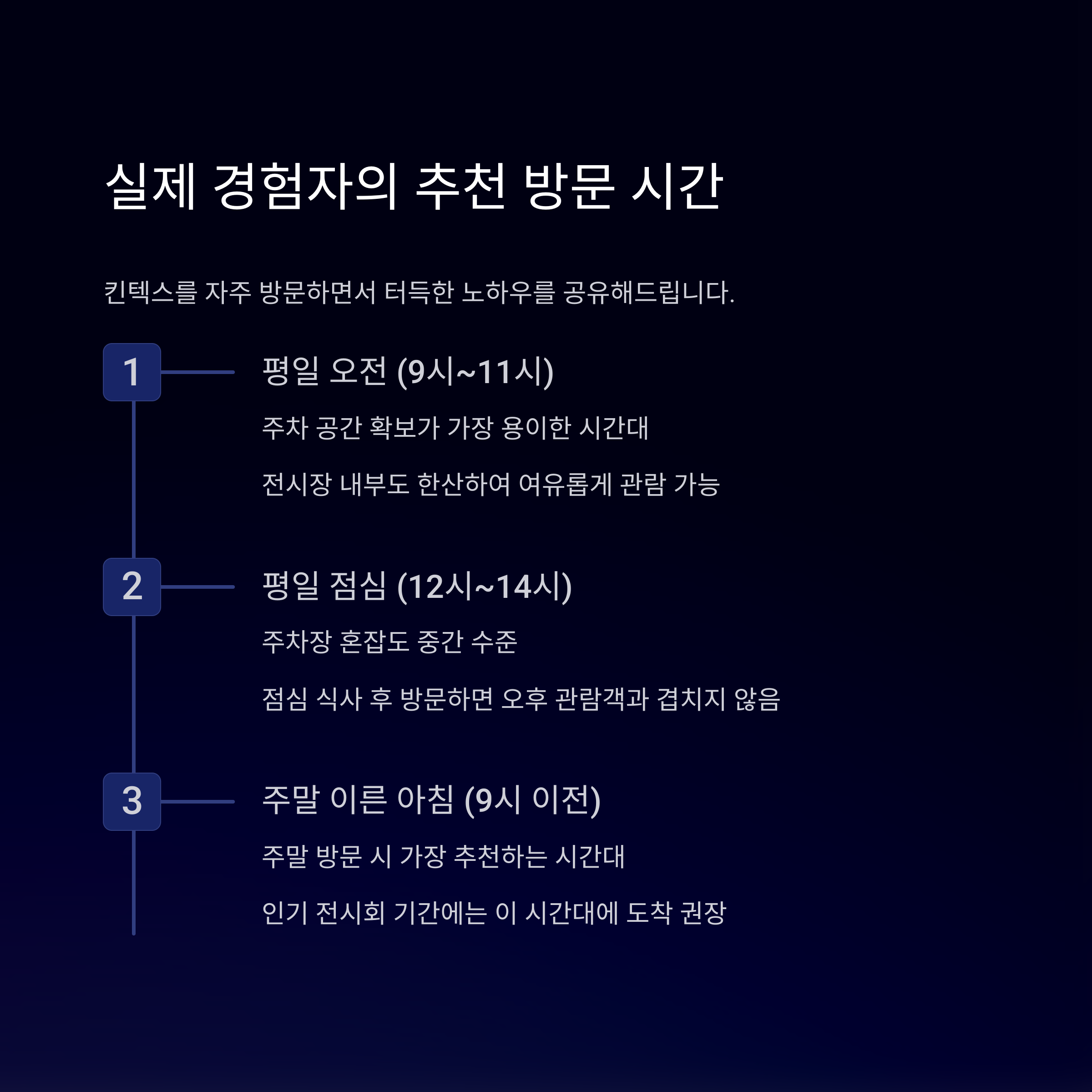먼저 평일 오전 시간대에 방문하면 주차 공간 확보가 용이합니다. 주말이나 인기 전시회 기간에는 오전 9시 이전 도착을 권장드립니다.
