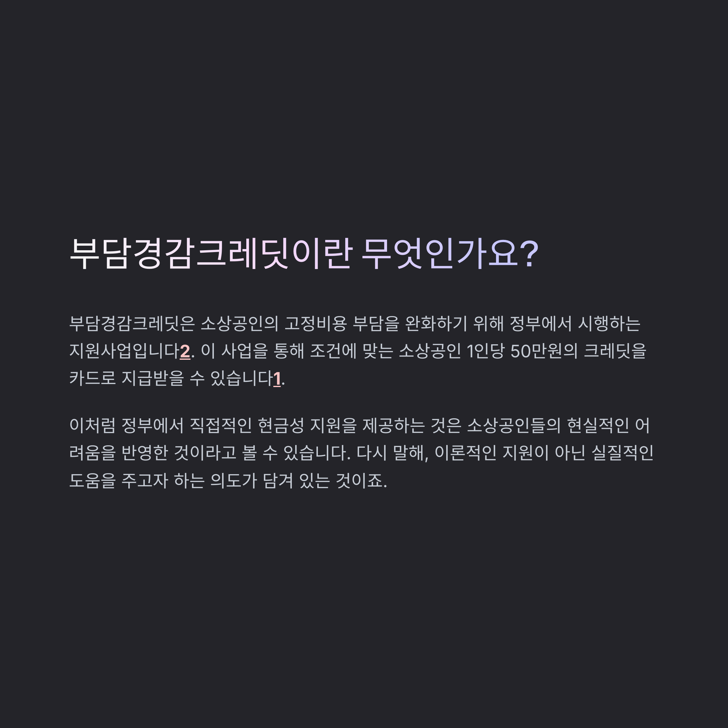 부담경감크레딧은 소상공인의 고정비용 부담을 완화하기 위해 정부에서 시행하는 지원사업입니다. 이 사업을 통해 조건에 맞는 소상공인 1인당 50만원의 크레딧을 카드로 지급받을 수 있습니다.