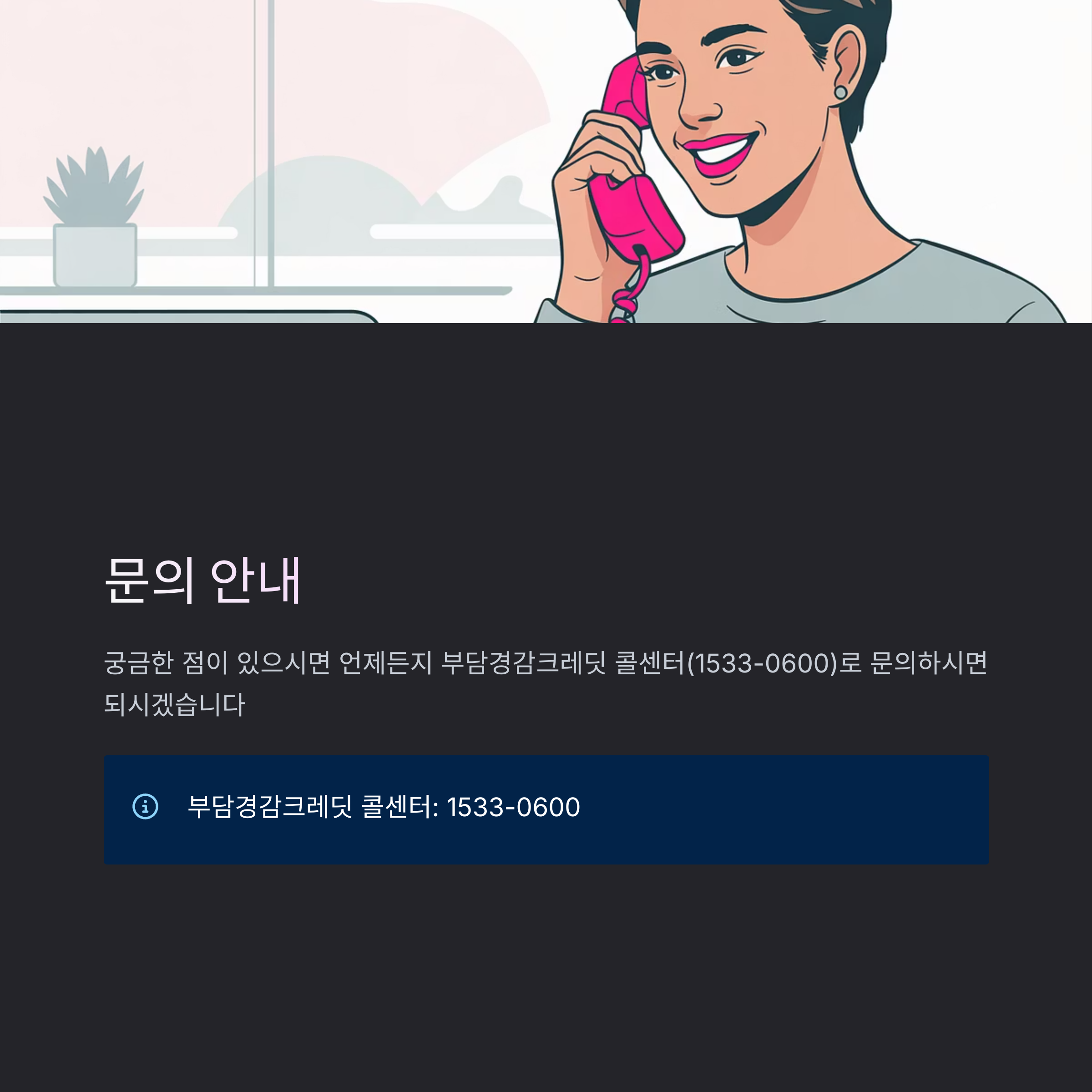 궁금한 점이 있으시면 언제든지 부담경감크레딧 콜센터(1533-0600)로 문의하시면 되시겠습니다