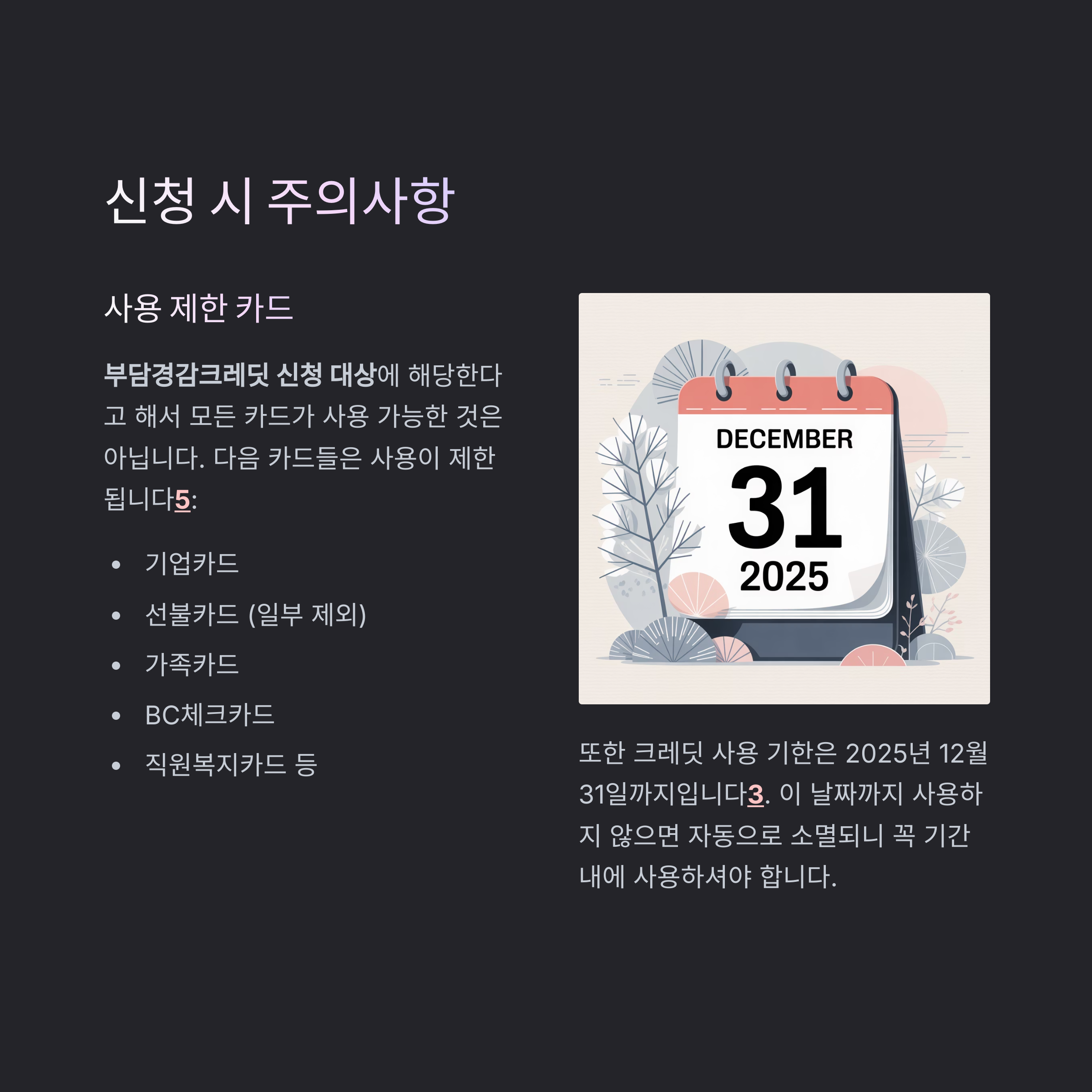 부담경감크레딧 신청 대상에 해당한다고 해서 모든 카드가 사용 가능한 것은 아닙니다. 다음 카드들은 사용이 제한됩니다