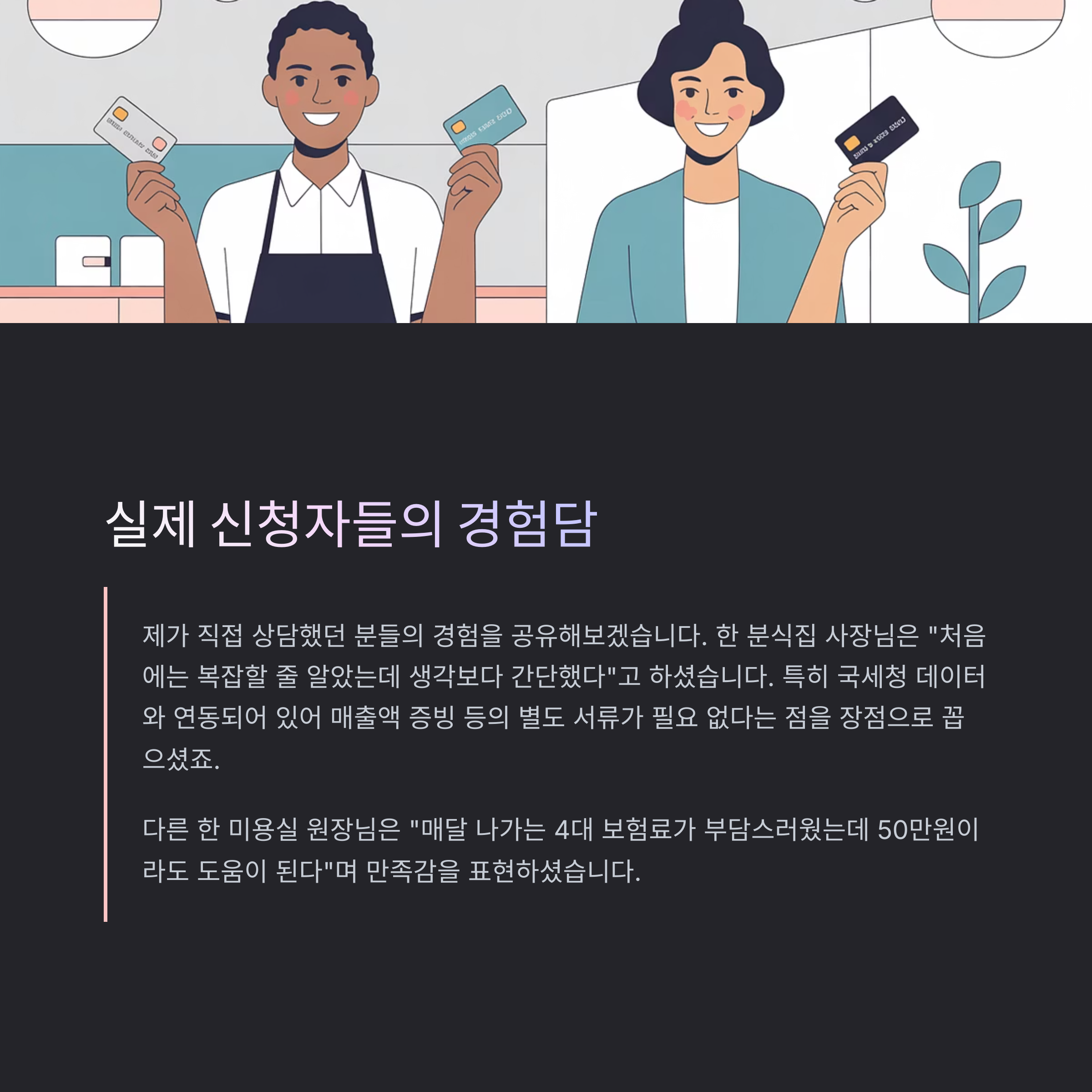 다른 한 미용실 원장님은 "매달 나가는 4대 보험료가 부담스러웠는데 50만원이라도 도움이 된다"며 만족감을 표현하셨습니다.