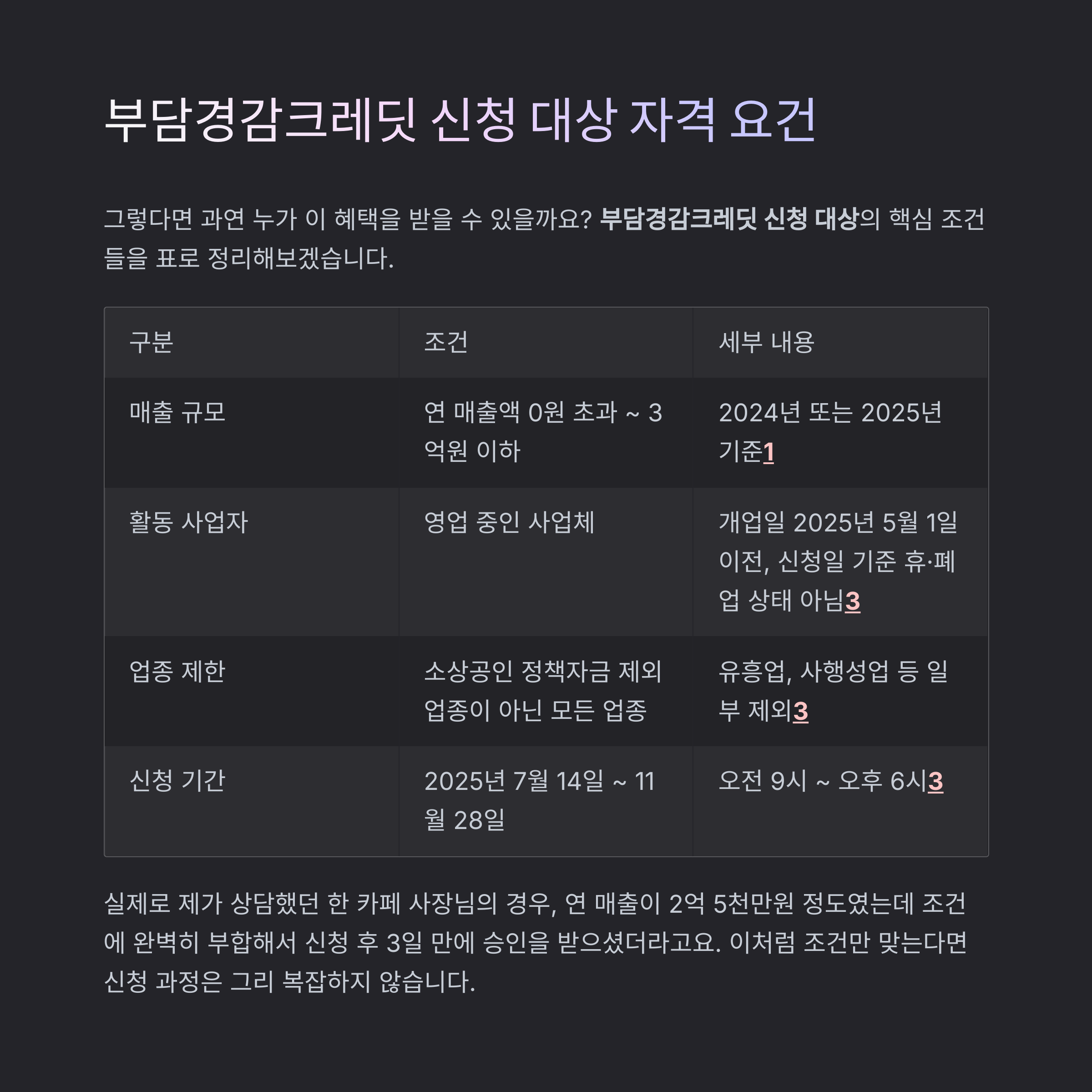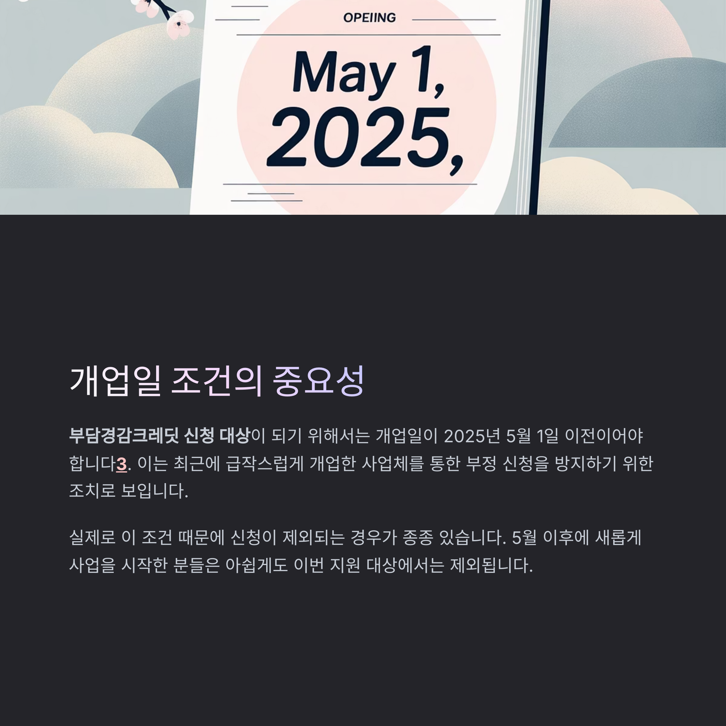 부담경감크레딧 신청 대상이 되기 위해서는 개업일이 2025년 5월 1일 이전이어야 합니다. 이는 최근에 급작스럽게 개업한 사업체를 통한 부정 신청을 방지하기 위한 조치로 보입니다.