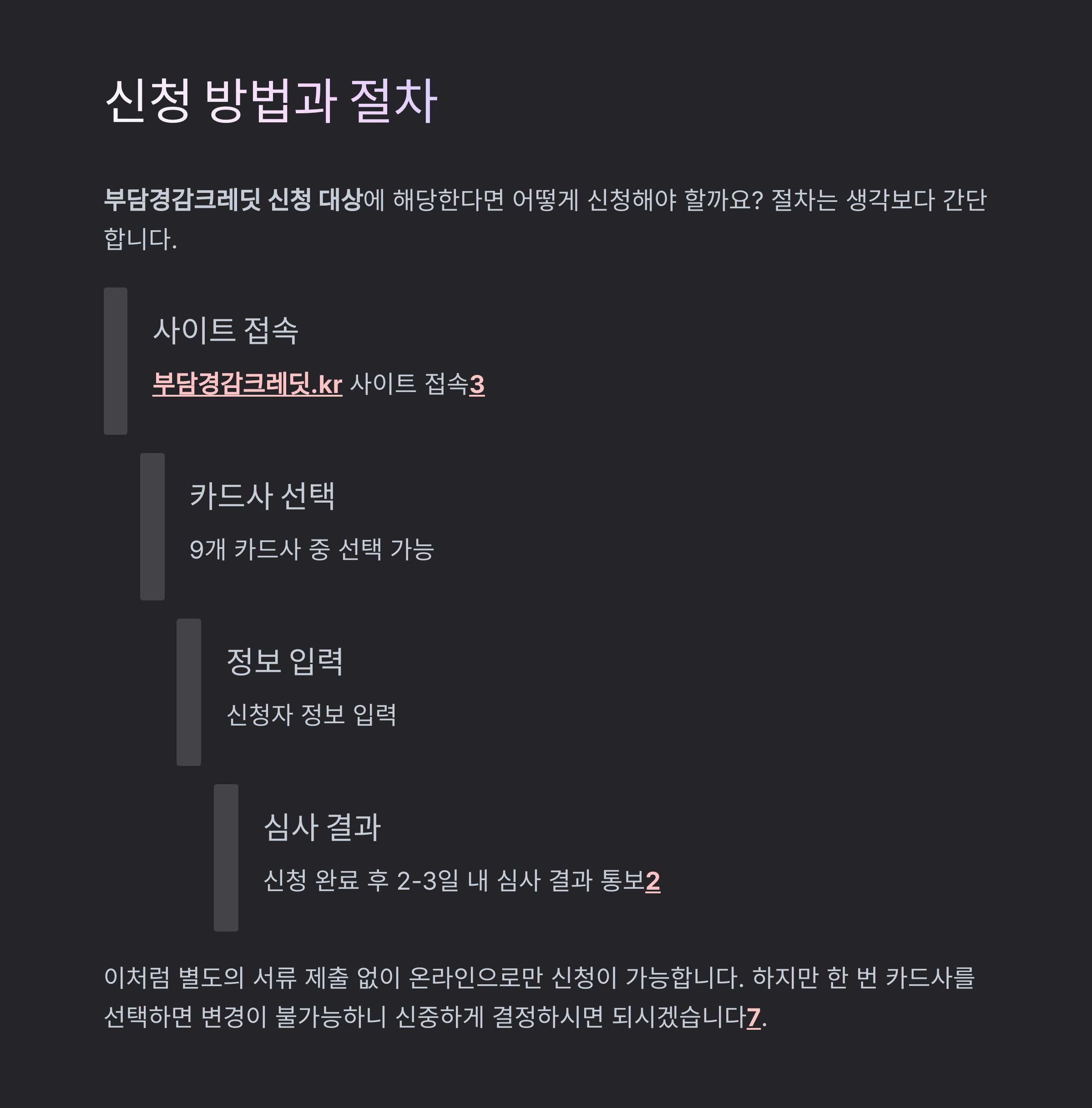 이처럼 별도의 서류 제출 없이 온라인으로만 신청이 가능합니다. 하지만 한 번 카드사를 선택하면 변경이 불가능하니 신중하게 결정하시면 되시겠습니다