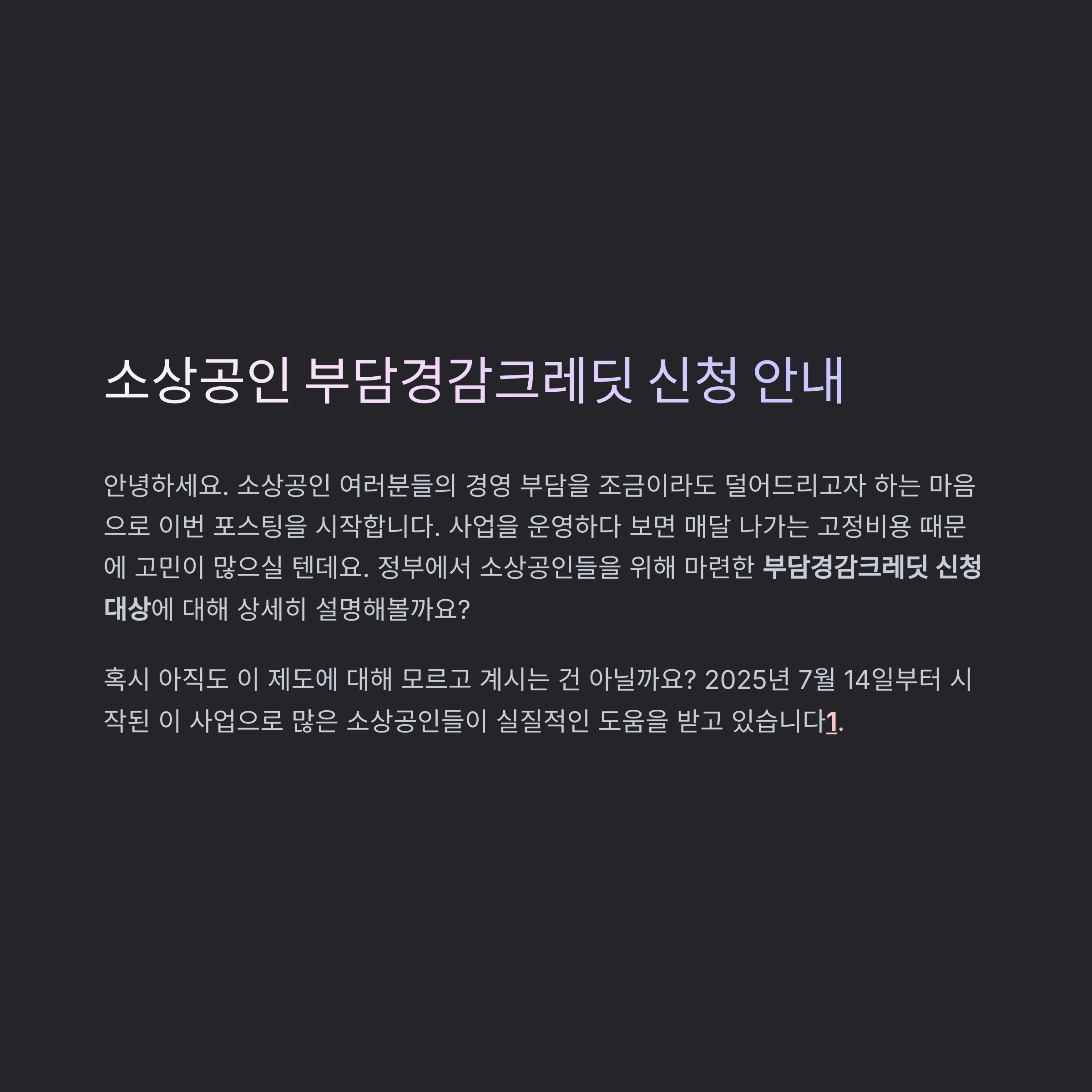 안녕하세요. 소상공인 여러분들의 경영 부담을 조금이라도 덜어드리고자 하는 마음으로 이번 포스팅을 시작합니다. 사업을 운영하다 보면 매달 나가는 고정비용 때문에 고민이 많으실 텐데요. 정부에서 소상공인들을 위해 마련한 부담경감크레딧 신청 대상에 대해 상세히 설명해볼까요?