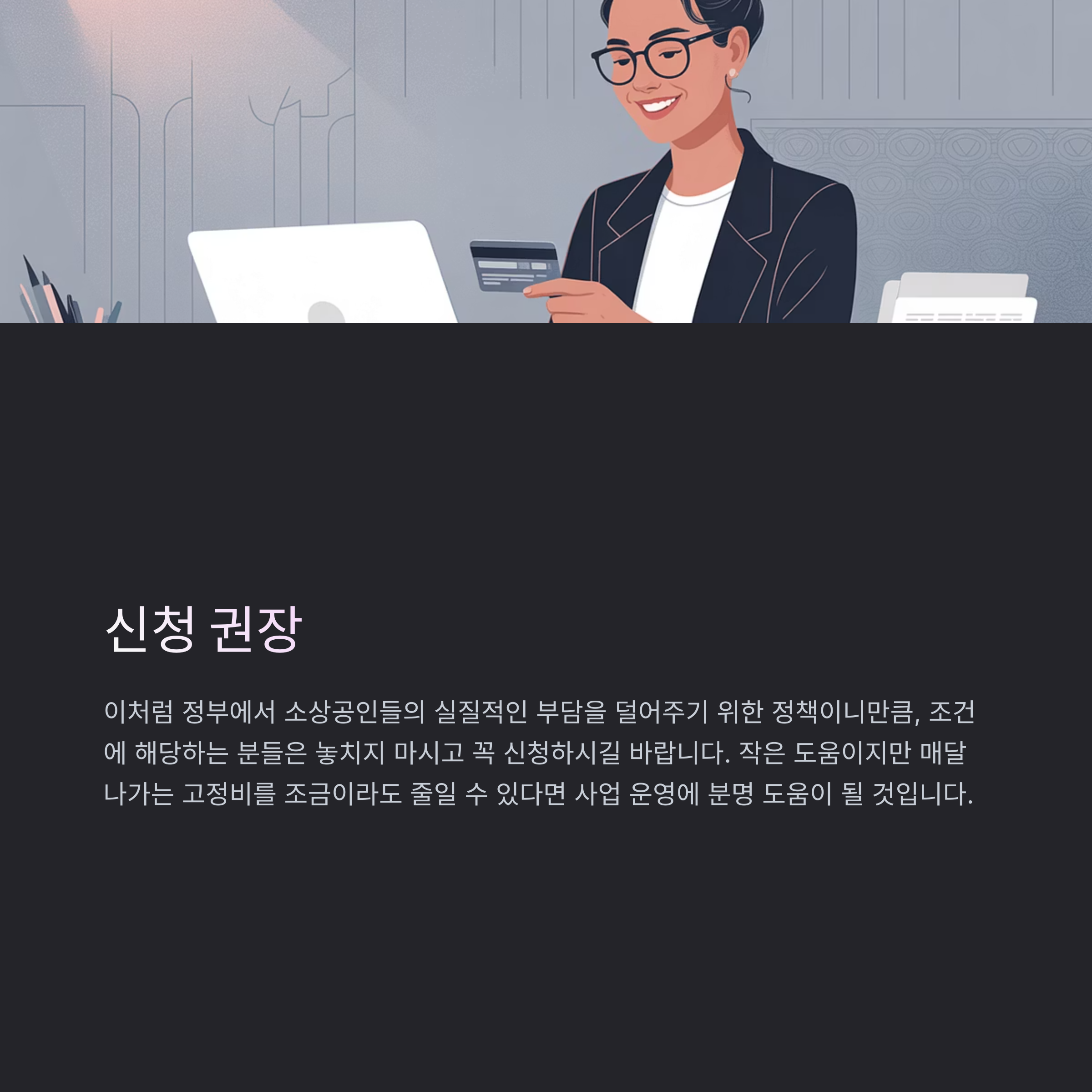 이처럼 정부에서 소상공인들의 실질적인 부담을 덜어주기 위한 정책이니만큼, 조건에 해당하는 분들은 놓치지 마시고 꼭 신청하시길 바랍니다. 작은 도움이지만 매달 나가는 고정비를 조금이라도 줄일 수 있다면 사업 운영에 분명 도움이 될 것입니다.