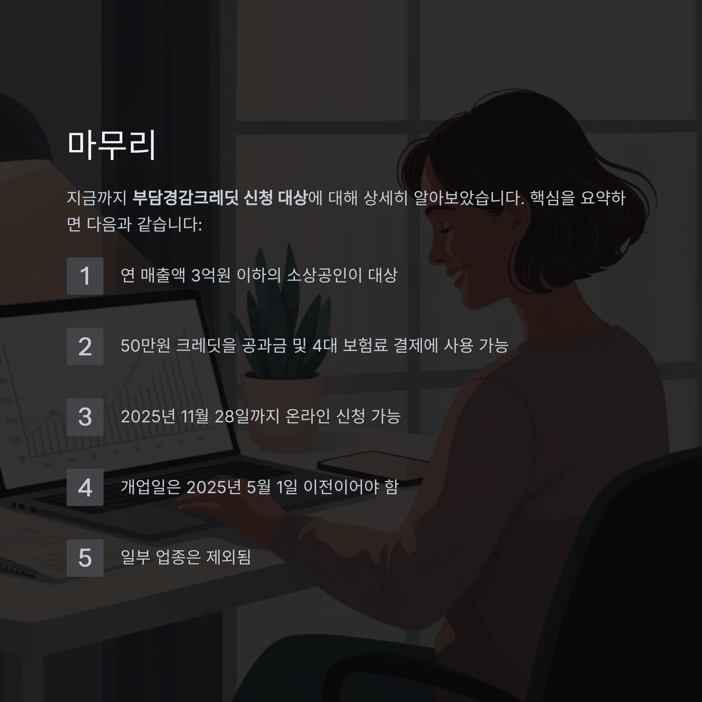 지금까지 부담경감크레딧 신청 대상에 대해 상세히 알아보았습니다. 핵심을 요약하면 다음과 같습니다:
