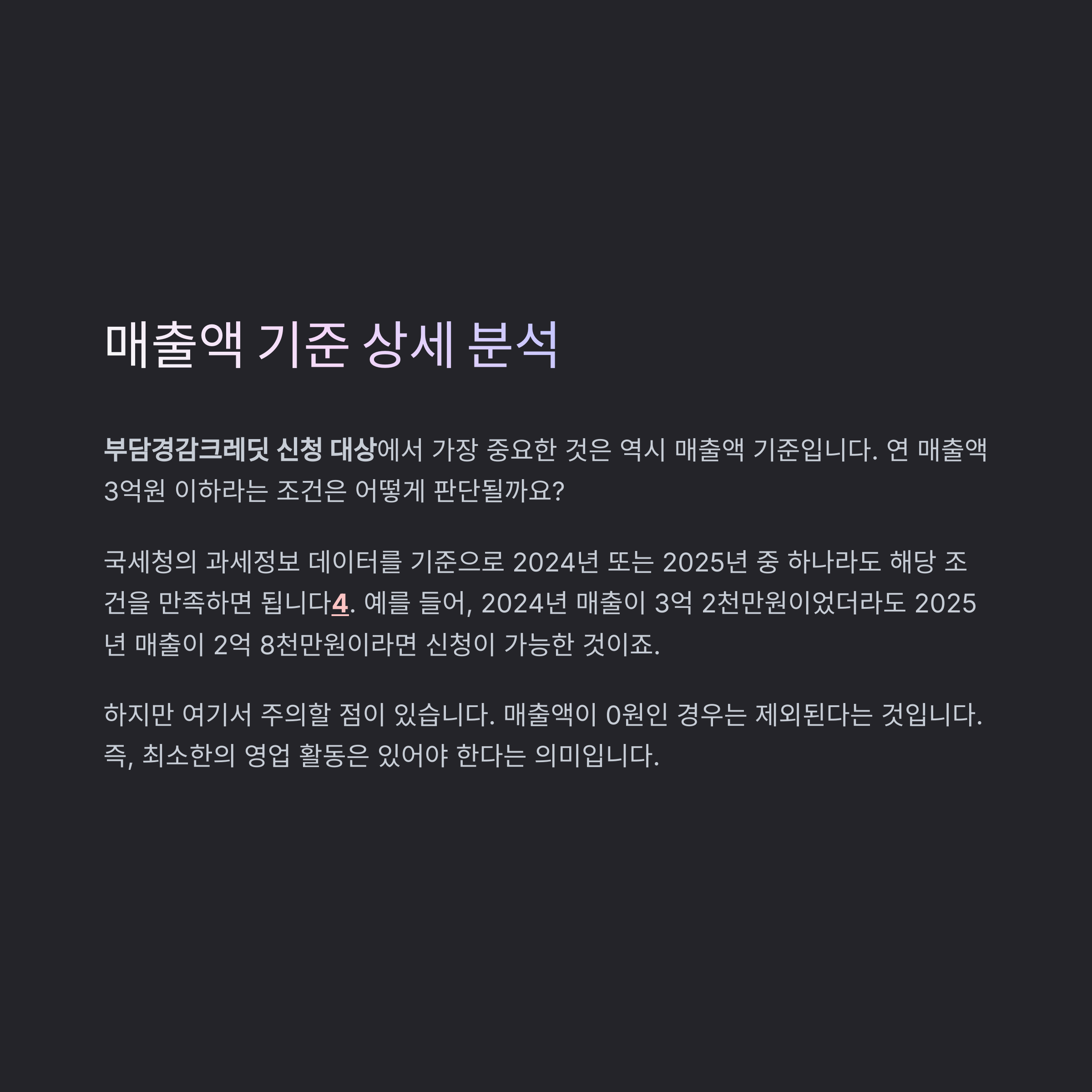 부담경감크레딧 신청 대상에서 가장 중요한 것은 역시 매출액 기준입니다. 연 매출액 3억원 이하라는 조건은 어떻게 판단될까요?