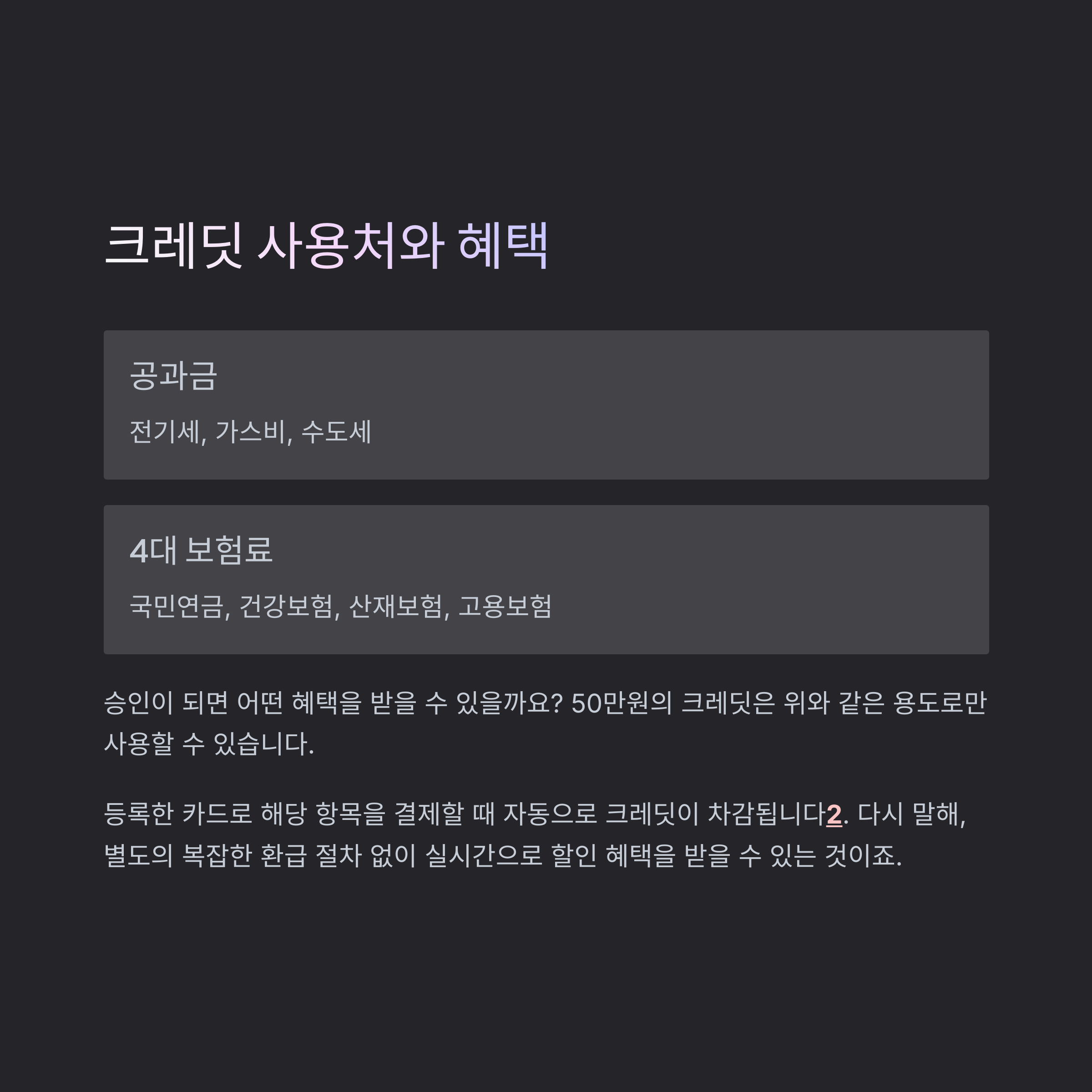 - 50만원 크레딧을 공과금 및 4대 보험료 결제에 사용 가능