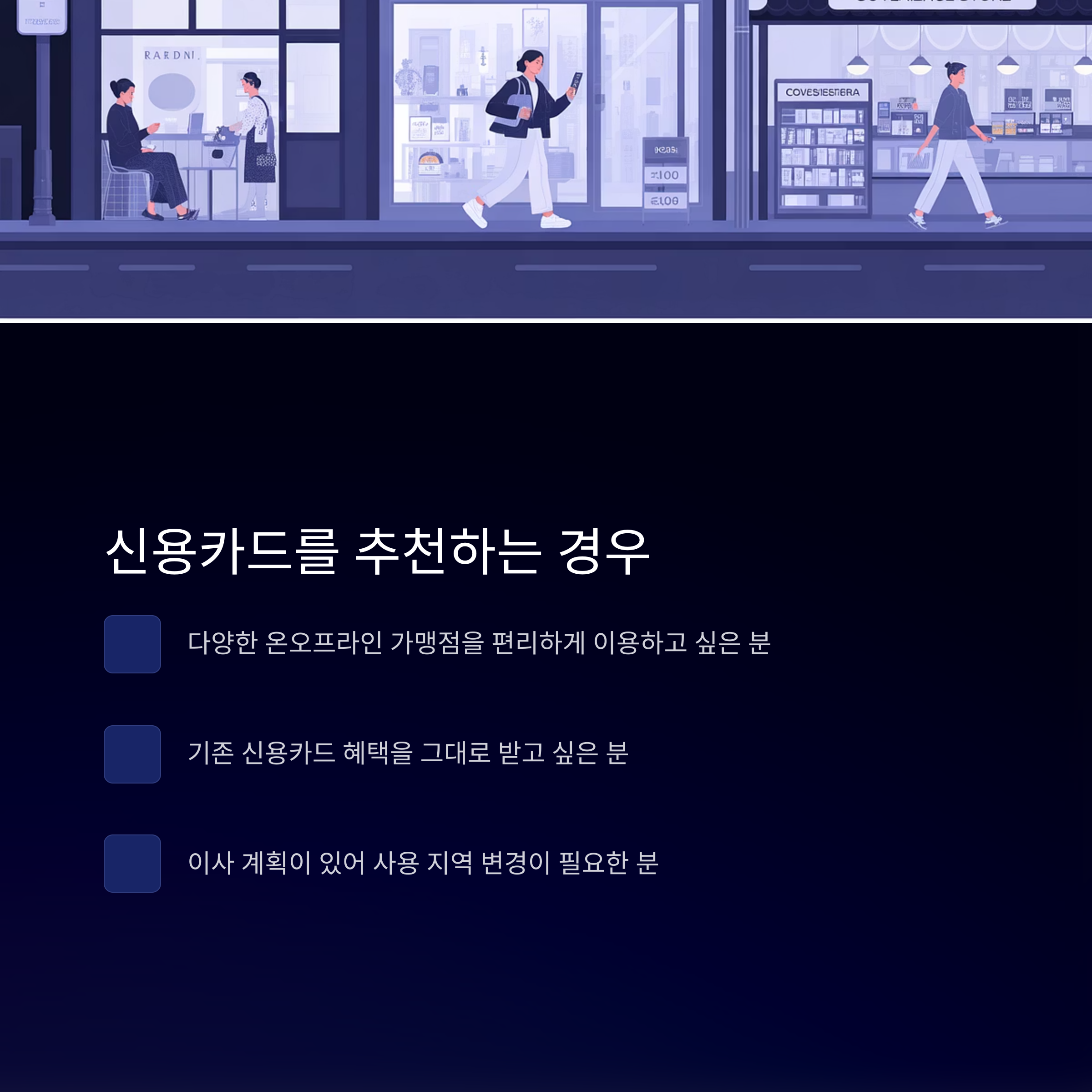 | 신용·체크카드 | 기존 카드로 간편하게 사용 할인·실적 혜택 유지 이사 시 지역 변경 가능 |