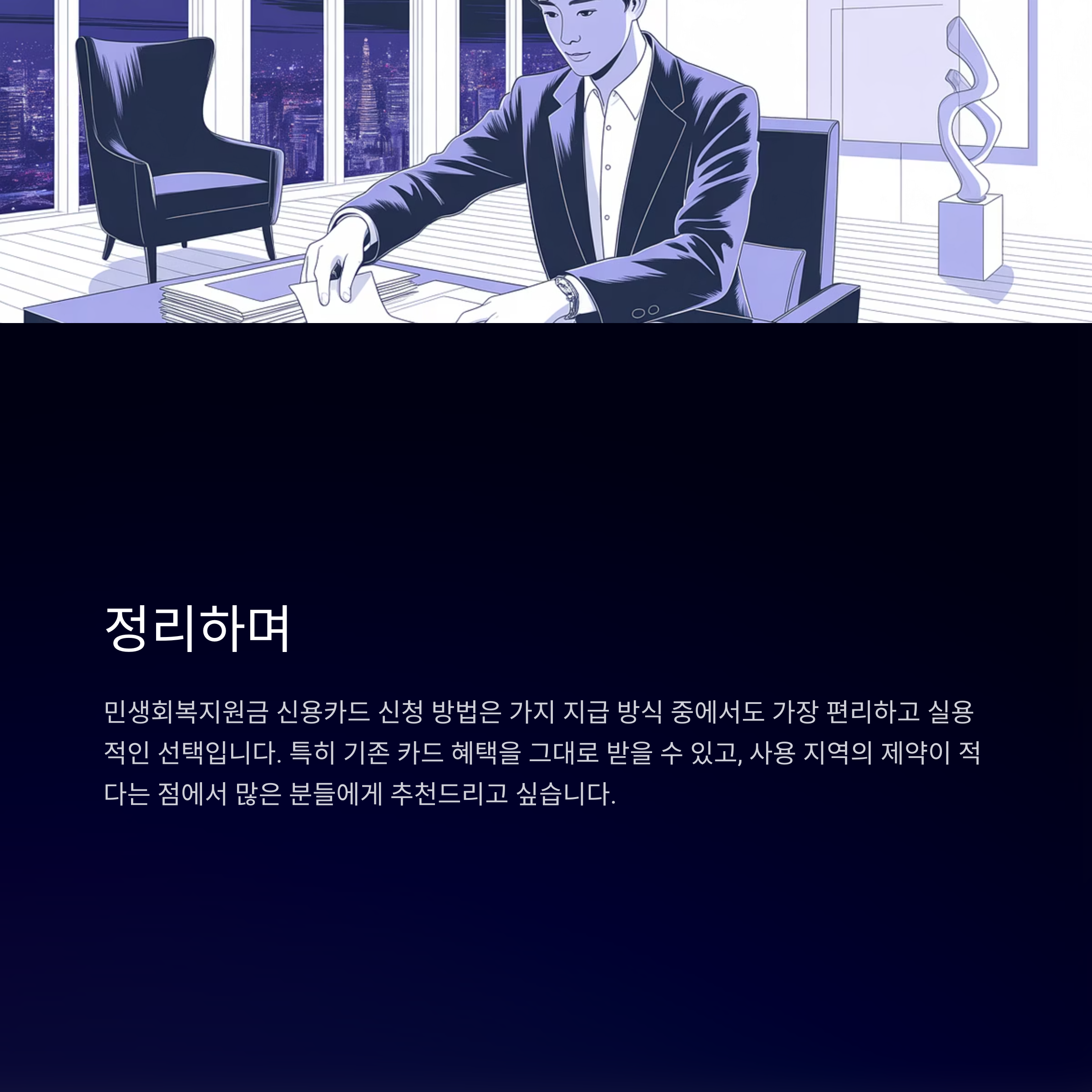 민생회복지원금 신용카드 신청 방법은 4가지 지급 방식 중에서도 가장 편리하고 실용적인 선택입니다. 특히 기존 카드 혜택을 그대로 받을 수 있고, 사용 지역의 제약이 적다는 점에서 많은 분들에게 추천드리고 싶습니다.