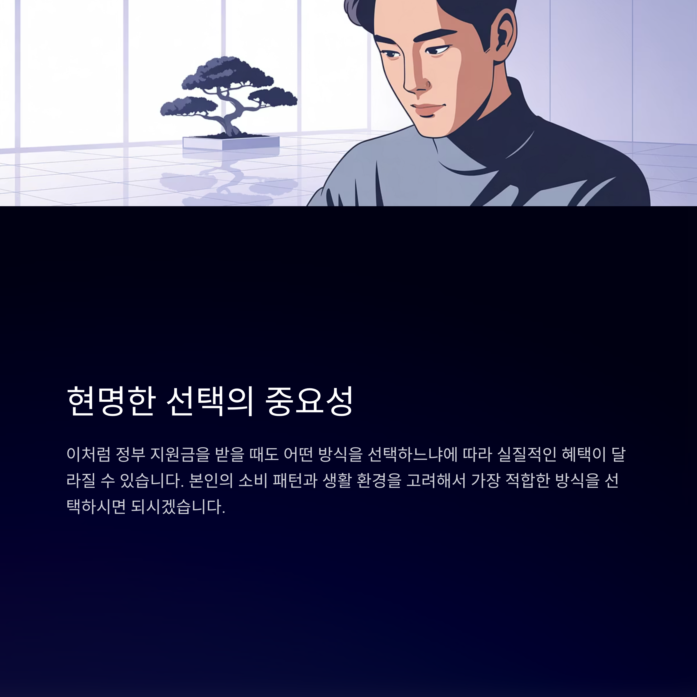 이처럼 정부 지원금을 받을 때도 어떤 방식을 선택하느냐에 따라 실질적인 혜택이 달라질 수 있습니다. 본인의 소비 패턴과 생활 환경을 고려해서 가장 적합한 방식을 선택하시면 되시겠습니다.