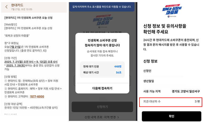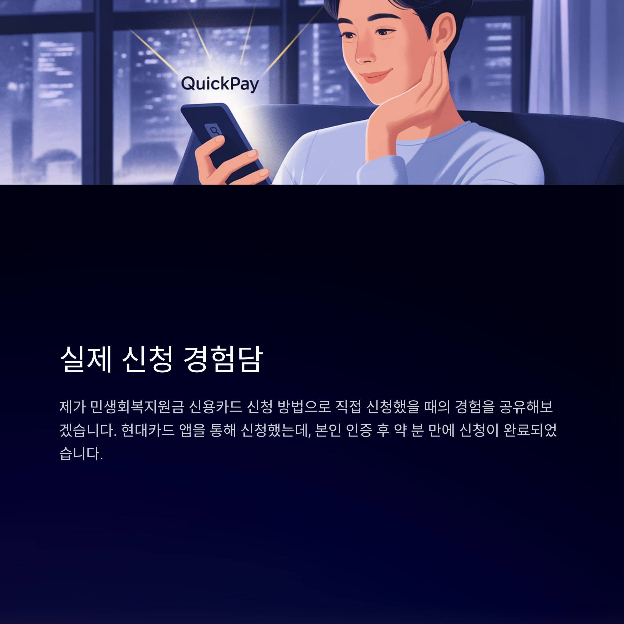 제가 민생회복지원금 신용카드 신청 방법으로 직접 신청했을 때의 경험을 공유해보겠습니다. 현대카드 앱을 통해 신청했는데, 본인 인증 후 약 3분 만에 신청이 완료되었습니다.