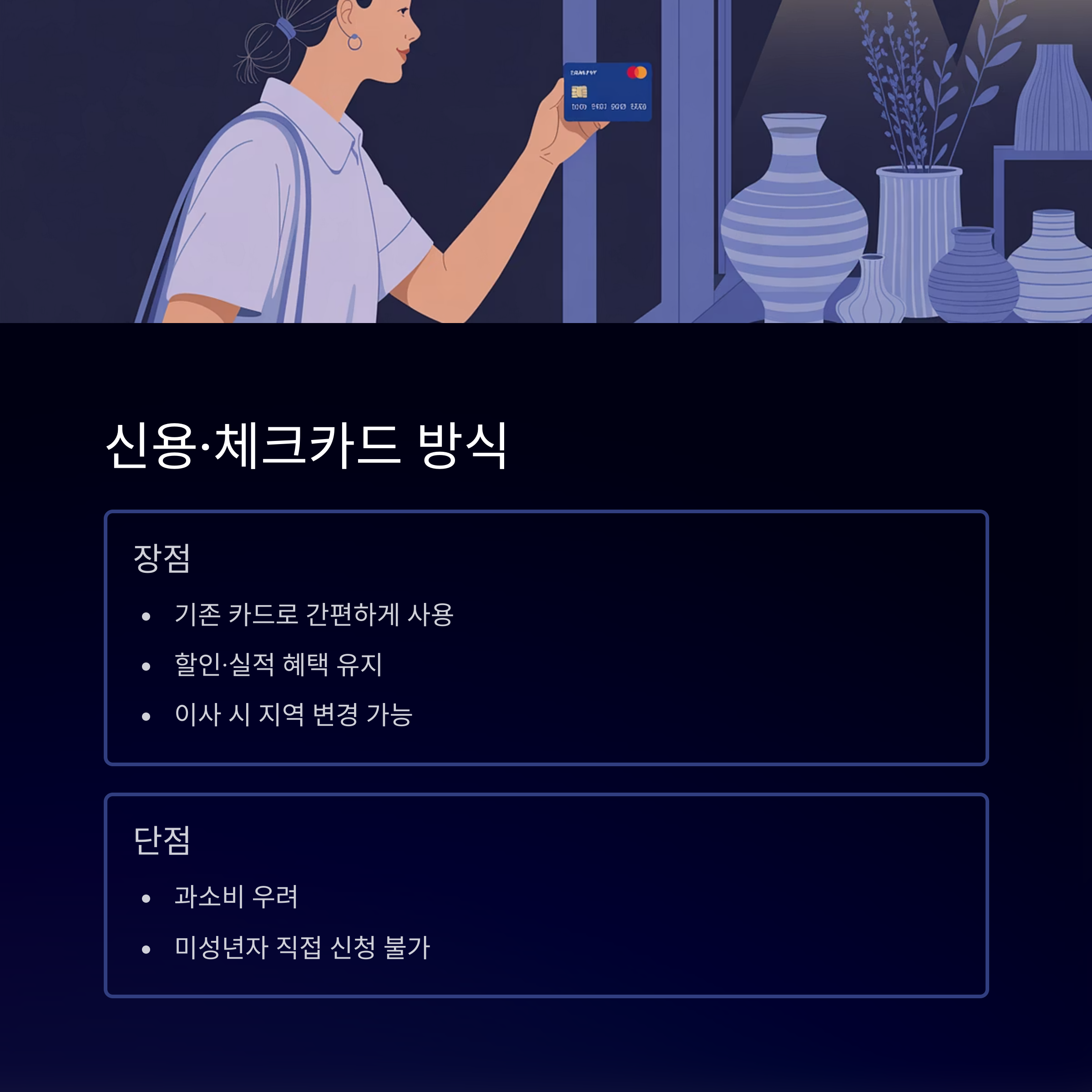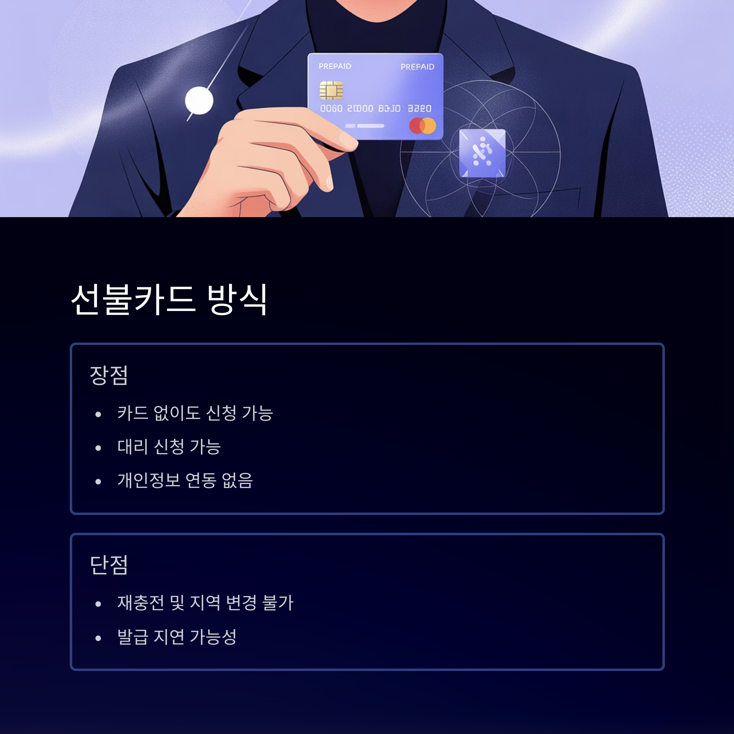 | 선불카드 | 카드 없이도 신청 가능 대리 신청 가능 개인정보 연동 없음 |