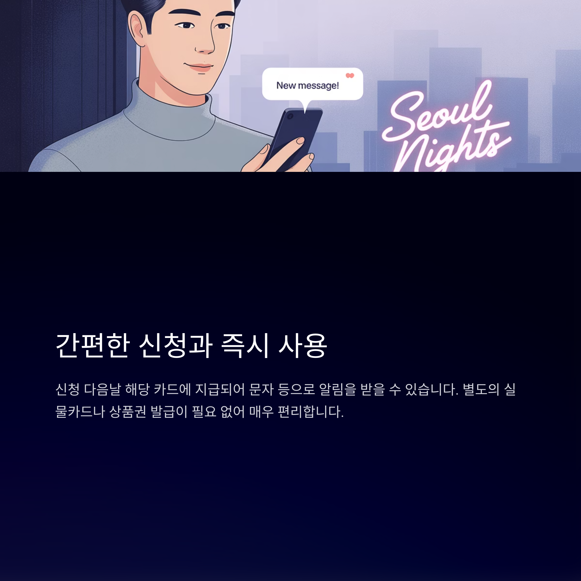 신청 다음날 해당 카드에 지급되어 문자 등으로 알림을 받을 수 있습니다. 별도의 실물카드나 상품권 발급이 필요 없어 매우 편리합니다.