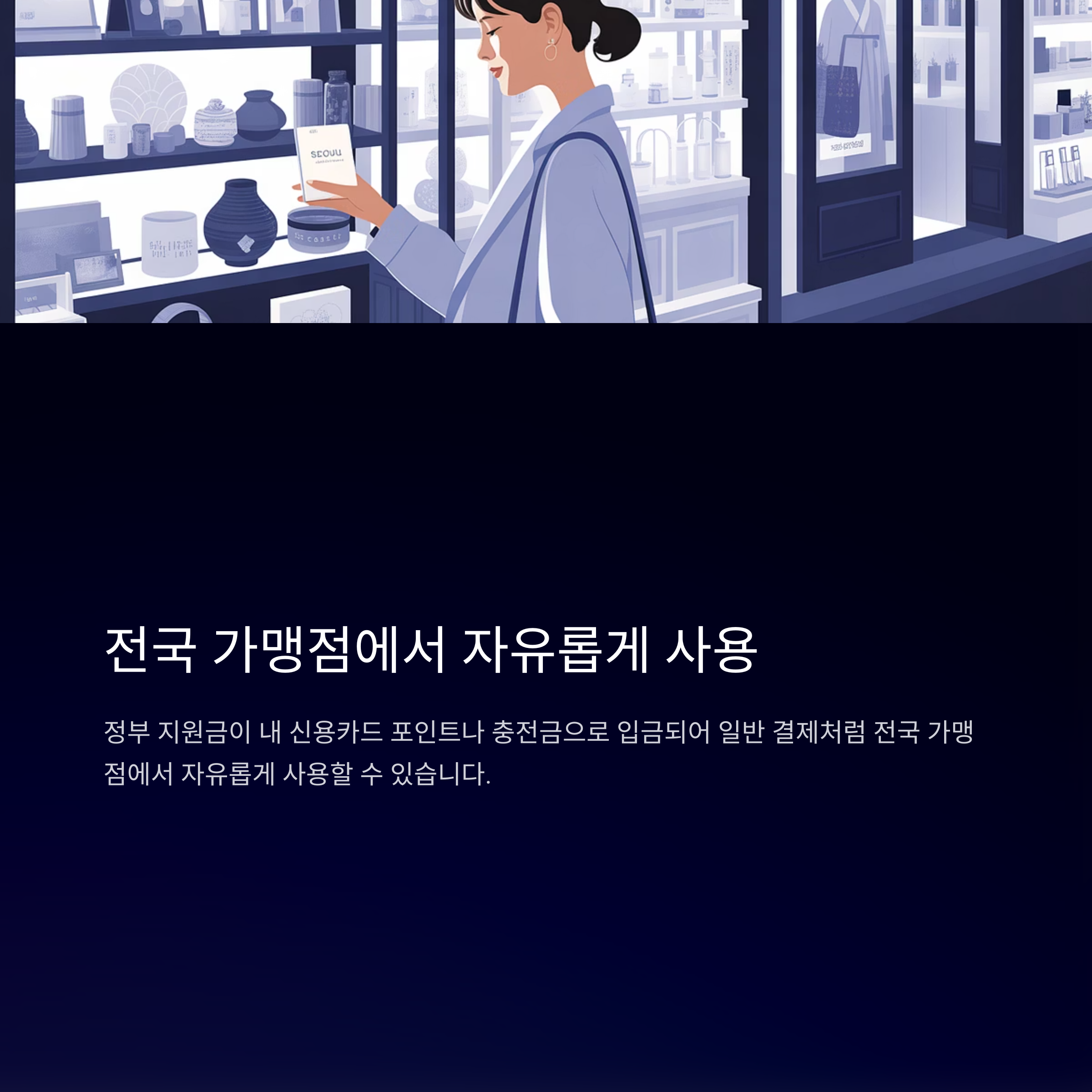 정부 지원금이 내 신용카드 포인트나 충전금으로 입금되어 일반 결제처럼 전국 가맹점에서 자유롭게 사용할 수 있습니다