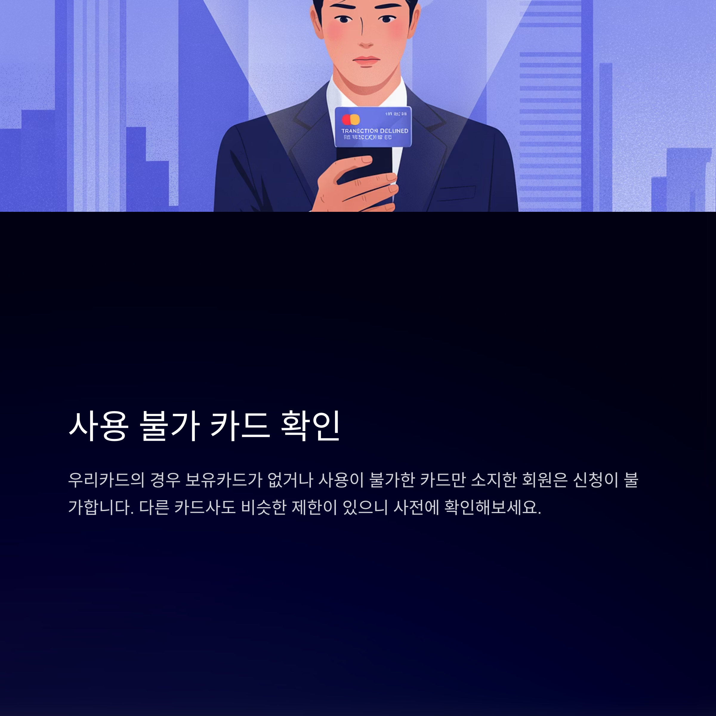 우리카드의 경우 보유카드가 없거나 사용이 불가한 카드만 소지한 회원은 신청이 불가합니다. 다른 카드사도 비슷한 제한이 있으니 사전에 확인해보세요.