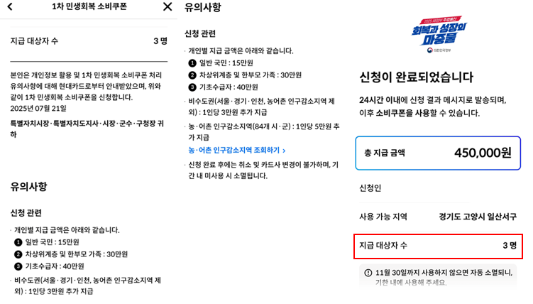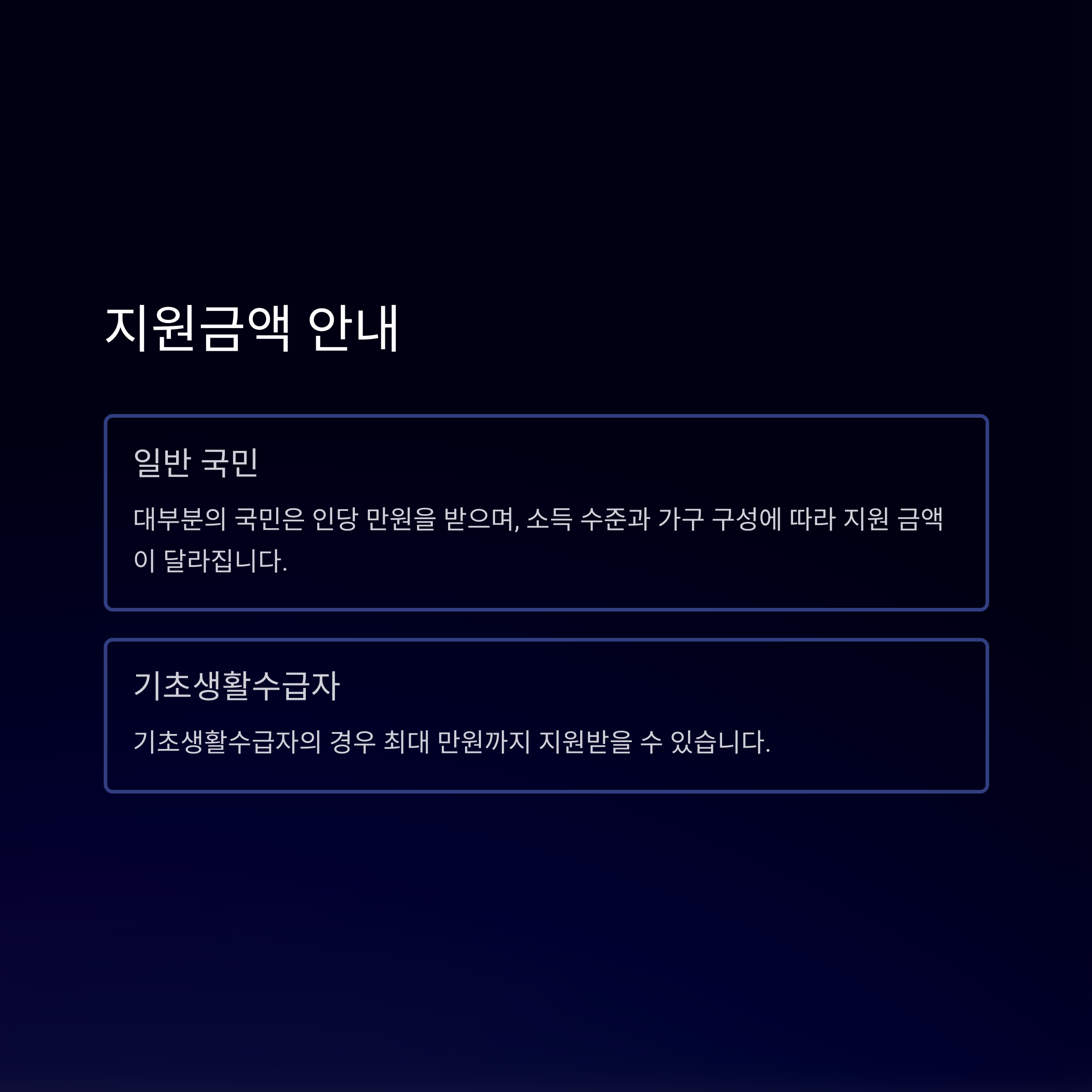 대부분의 국민은 1인당 15만원을 받으며, 기초생활수급자의 경우 최대 55만원까지 지원받을 수 있습니다3. 다시 말해, 소득 수준과 가구 구성에 따라 지원 금액이 달라지는 것이지요.