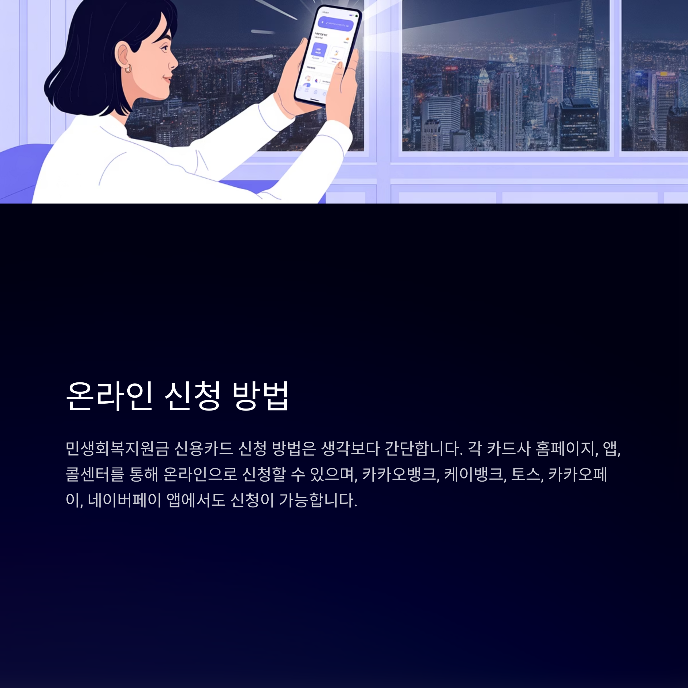 민생회복지원금 신용카드 신청 방법은 생각보다 간단합니다. 각 카드사 홈페이지, 앱, 콜센터를 통해 온라인으로 신청할 수 있으며카카오뱅크, 케이뱅크, 토스, 카카오페이, 네이버페이 앱에서도 신청이 가능합니다