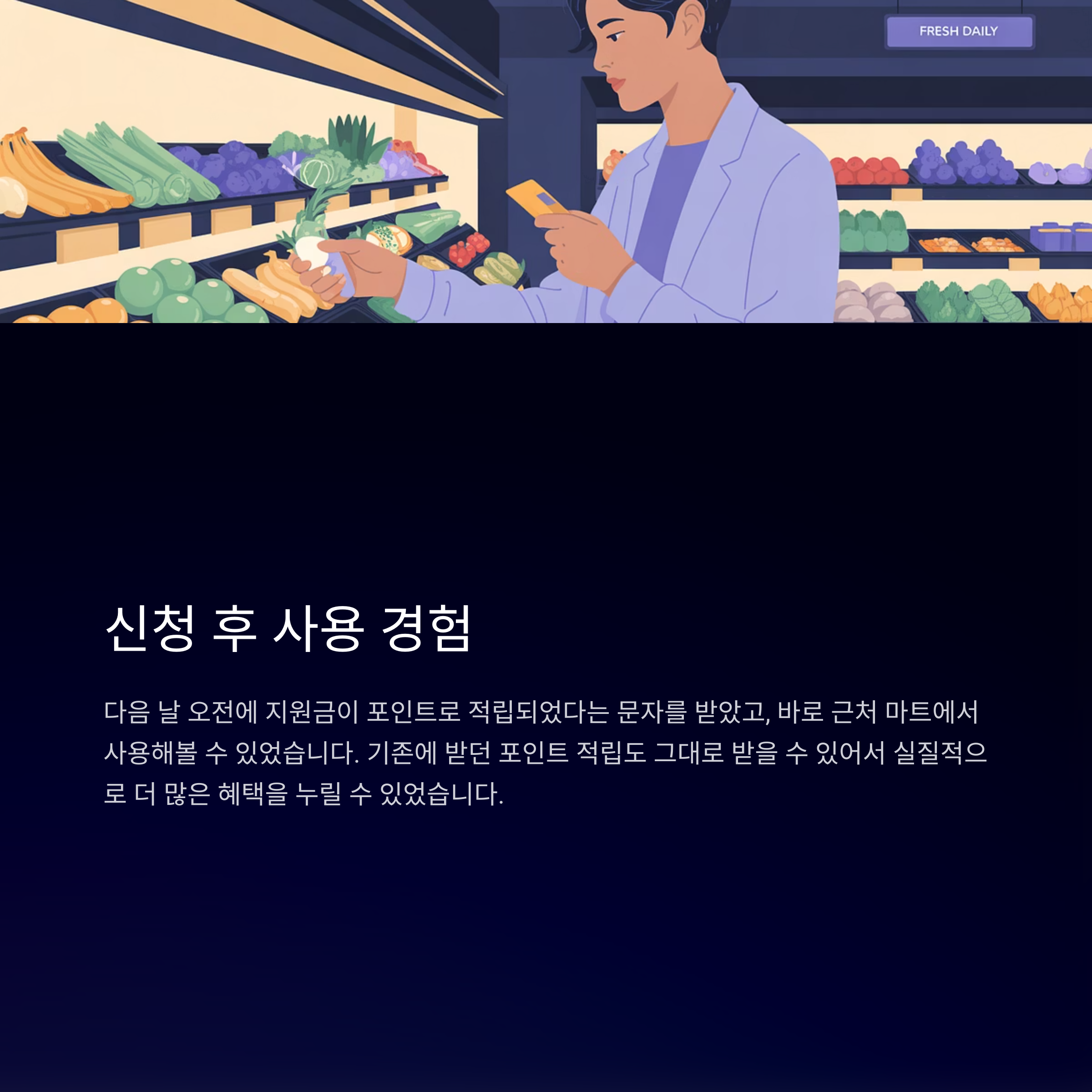 다음 날 오전에 지원금이 포인트로 적립되었다는 문자를 받았고, 바로 근처 마트에서 사용해볼 수 있었습니다. 기존에 받던 포인트 적립도 그대로 받을 수 있어서 실질적으로 더 많은 혜택을 누릴 수 있었습니다.