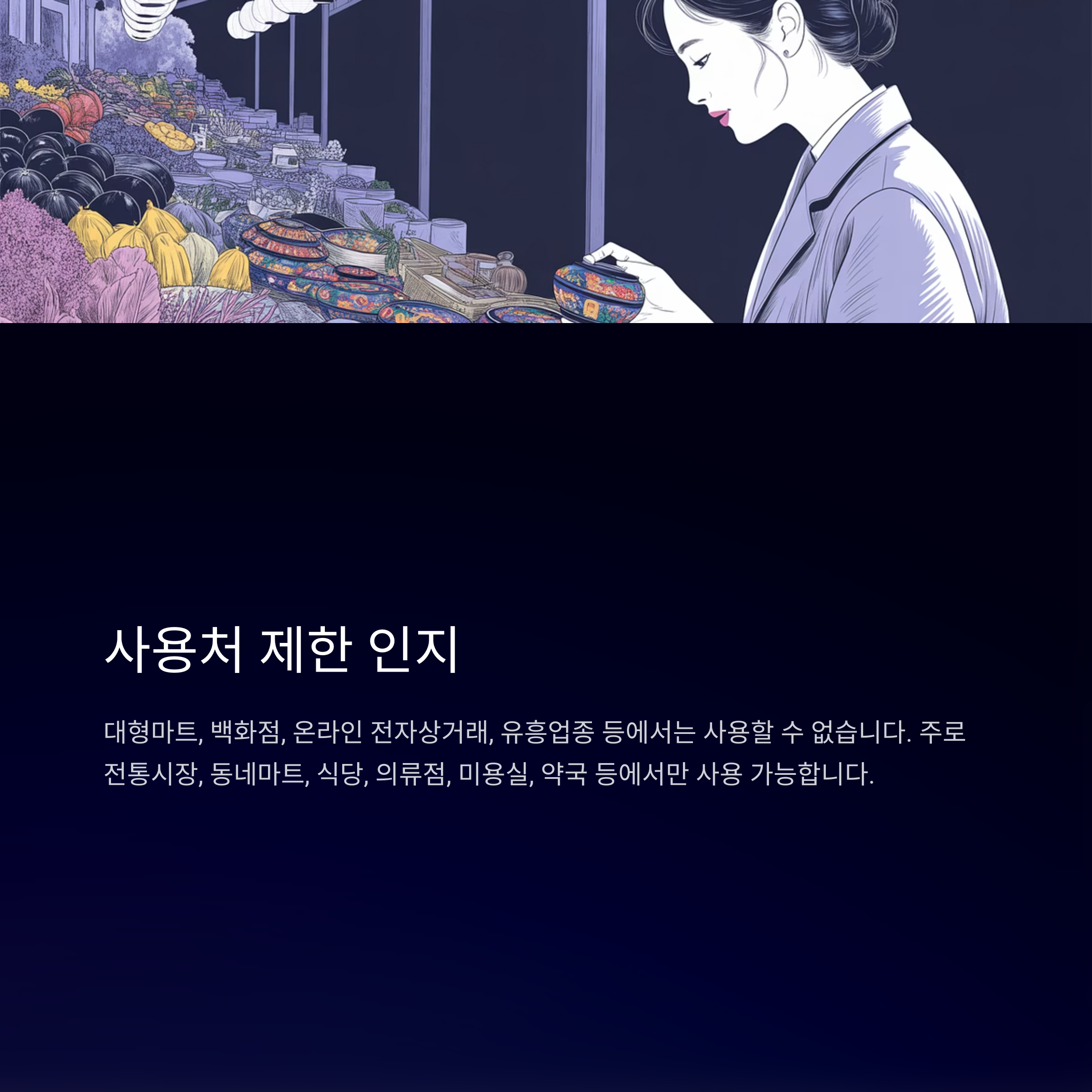 대형마트, 백화점, 온라인 전자상거래, 유흥업종 등에서는 사용할 수 없습니다. 주로 전통시장, 동네마트, 식당, 의류점, 미용실, 약국 등에서만 사용 가능합니다.