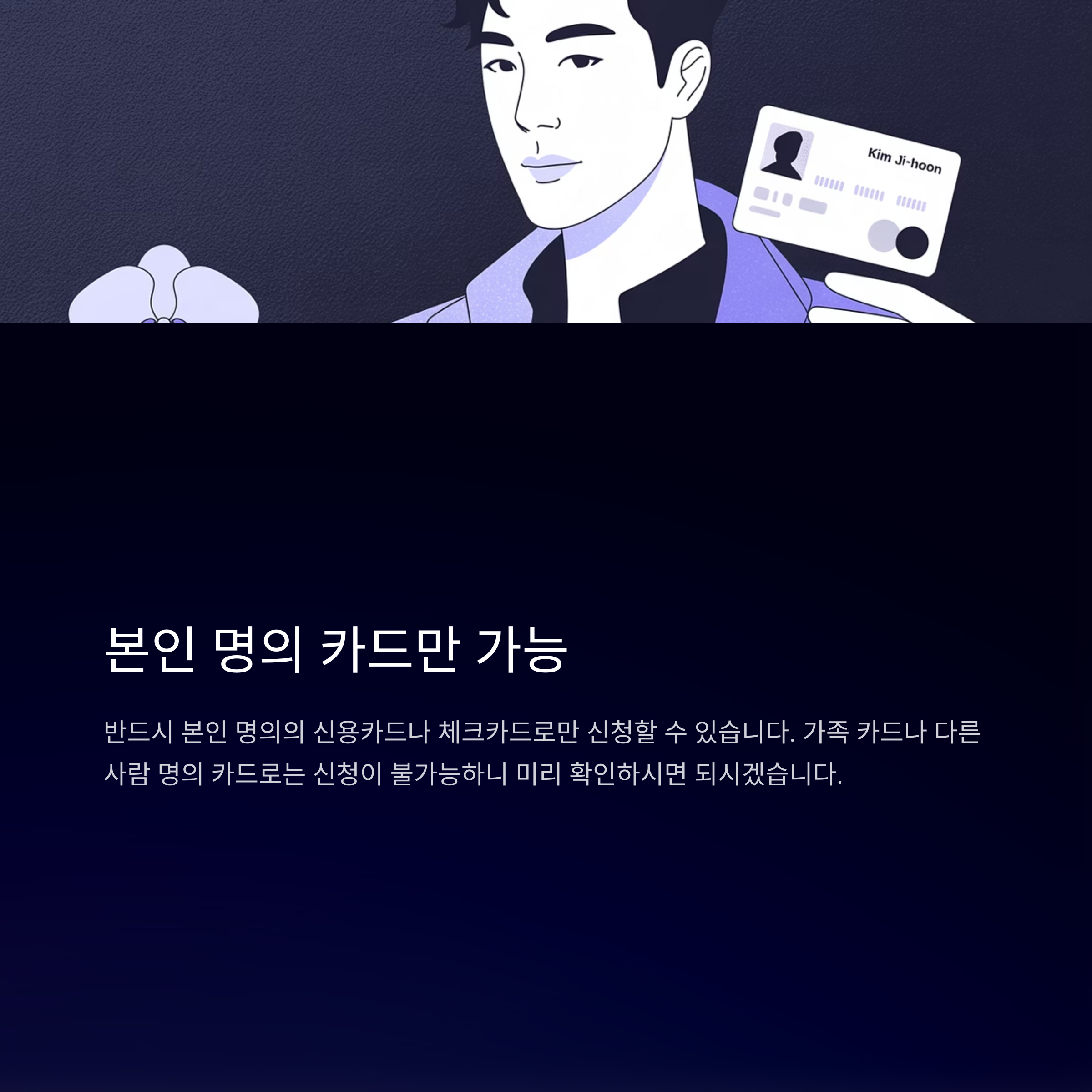 반드시 본인 명의의 신용카드나 체크카드로만 신청할 수 있습니다. 가족 카드나 다른 사람 명의 카드로는 신청이 불가능하니 미리 확인하시면 되시겠습니다.