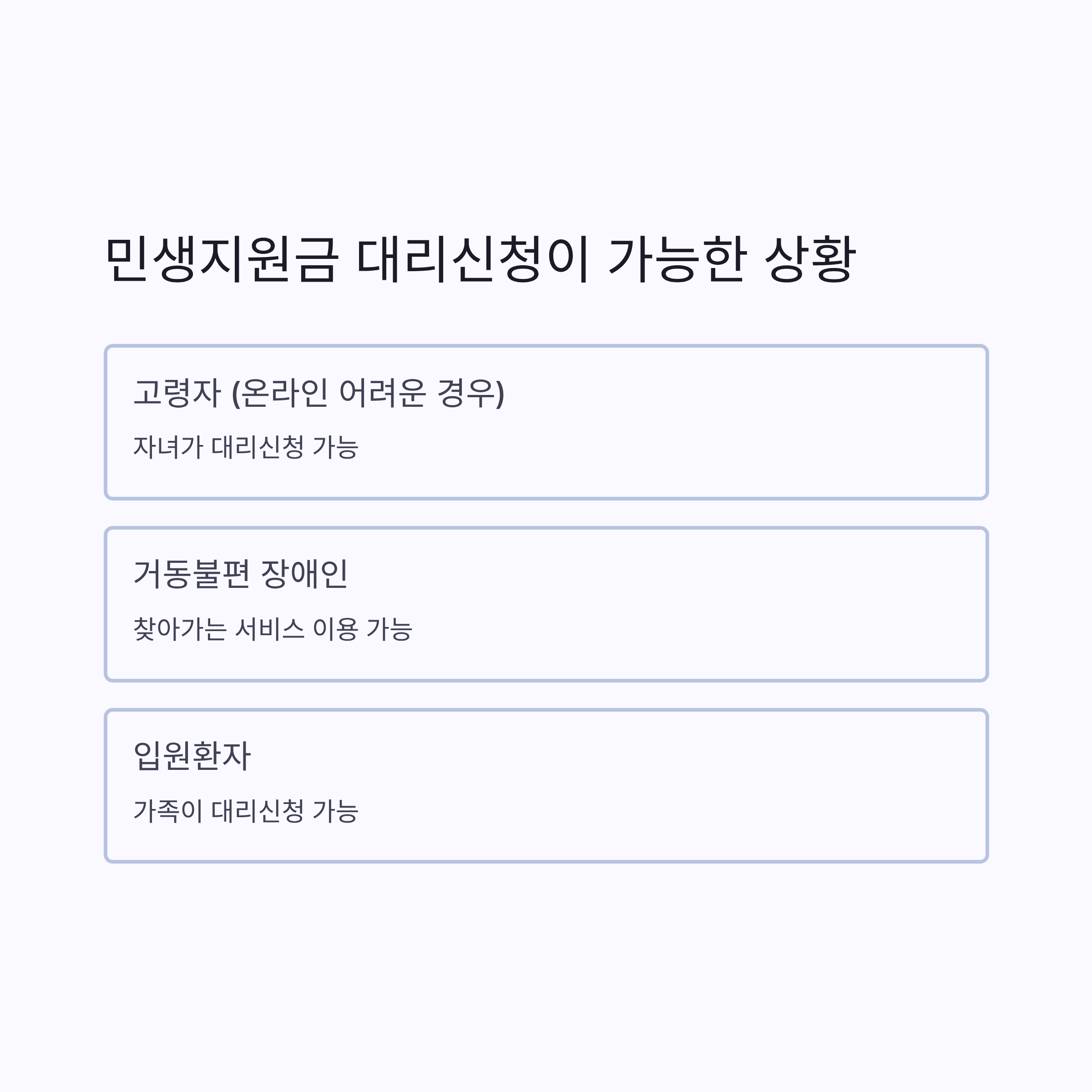 민생지원금 대리신청이 가능한 대상을 먼저 확인해보겠습니다. 다음과 같은 경우에 대리신청을 진행하실 수 있습니다.