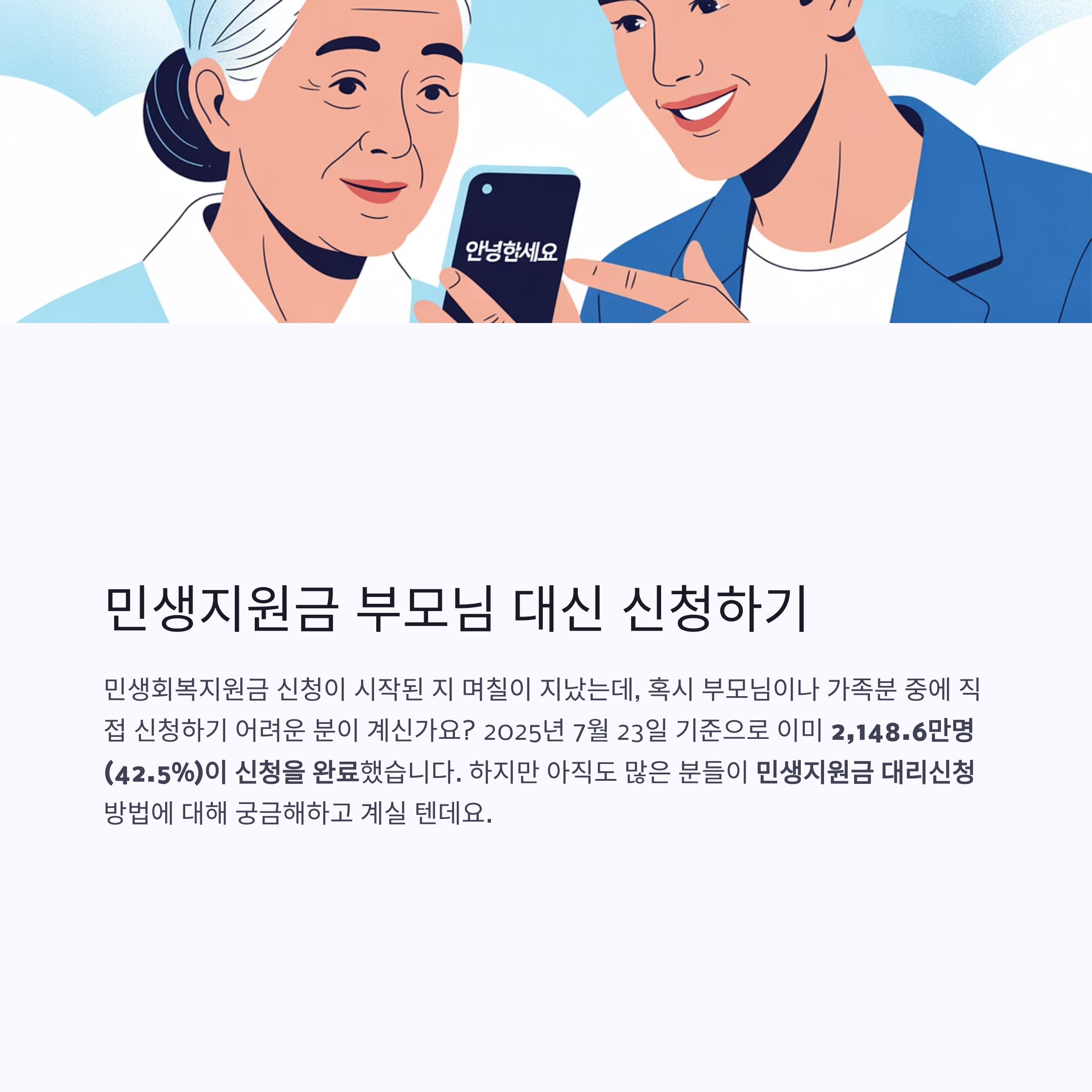 민생회복지원금 신청이 시작된 지 며칠이 지났는데, 혹시 부모님이나 가족분 중에 직접 신청하기 어려운 분이 계신가요? 2025년 7월 23일 기준으로 이미 2,148.6만명(42.5%)이 신청을 완료했습니다. 하지만 아직도 많은 분들이 민생지원금 대리신청 방법에 대해 궁금해하고 계실 텐데요.