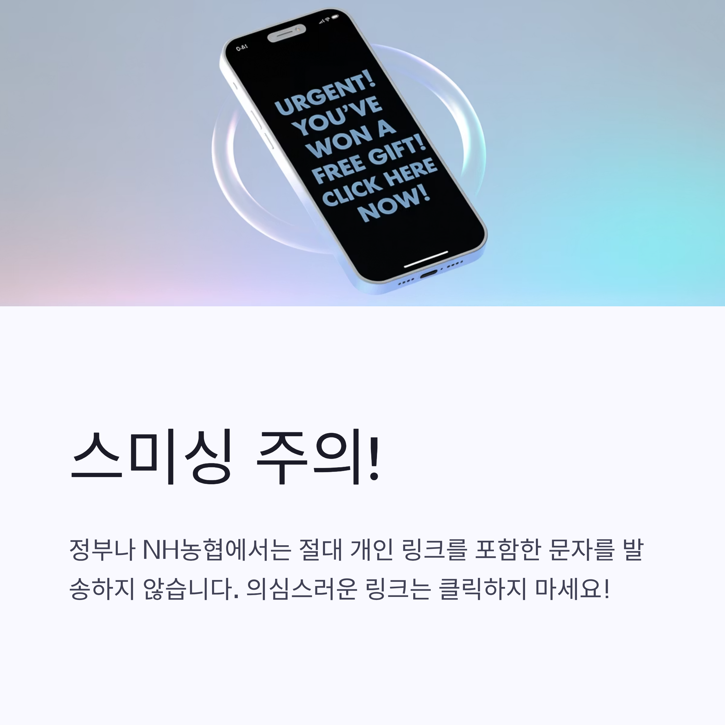 최근 민생지원금 관련 가짜 문자가 급증하고 있습니다. 정부나 NH농협에서는 절대 개인 링크를 포함한 문자를 발송하지 않으므로, 의심스러운 링크는 클릭하지 마시기 바랍니다.
