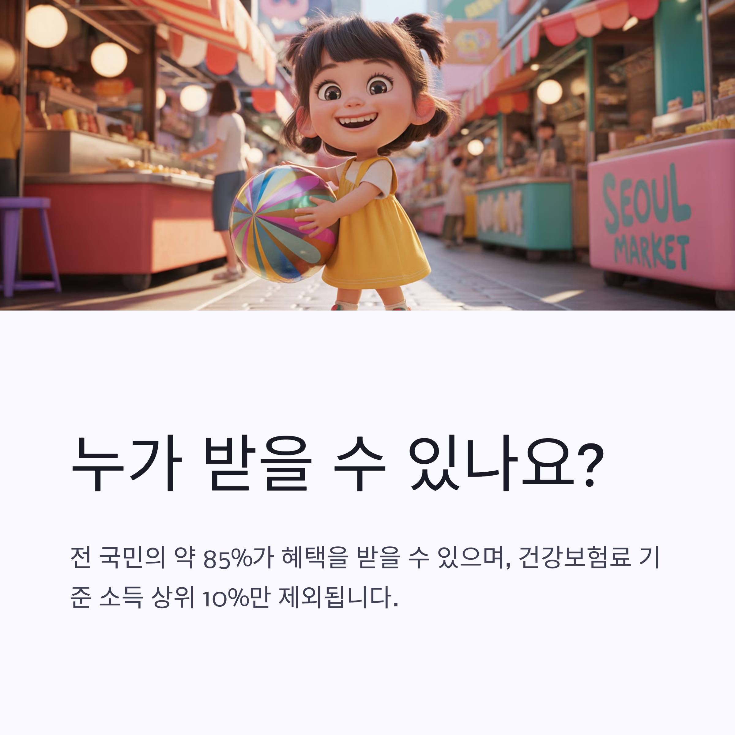 정부 발표에 따르면 전 국민의 약 85%가 혜택을 받을 수 있으며, 건강보험료 기준 소득 상위 10%만 제외됩니다.