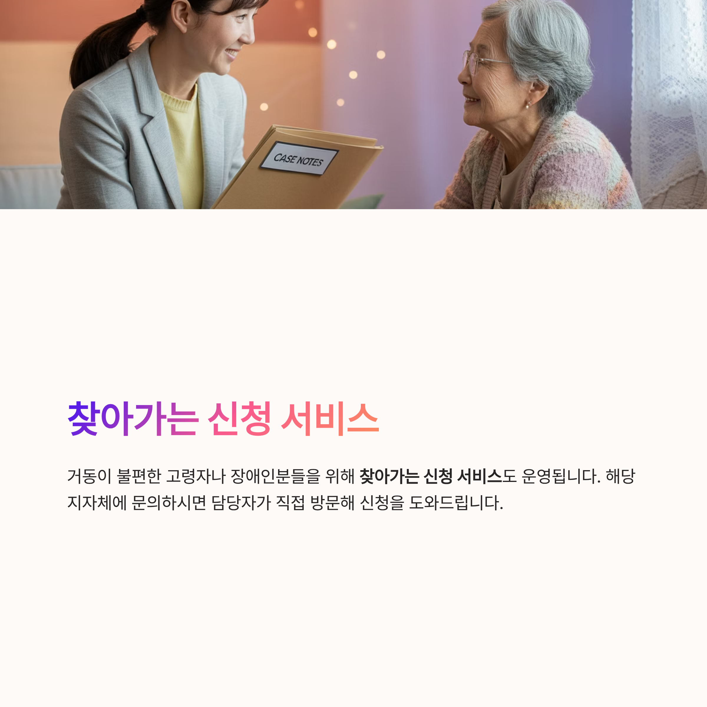 거동이 불편한 고령자나 장애인분들을 위해 찾아가는 신청 서비스도 운영됩니다. 해당 지자체에 문의하시면 담당자가 직접 방문해 신청을 도와드립니다.