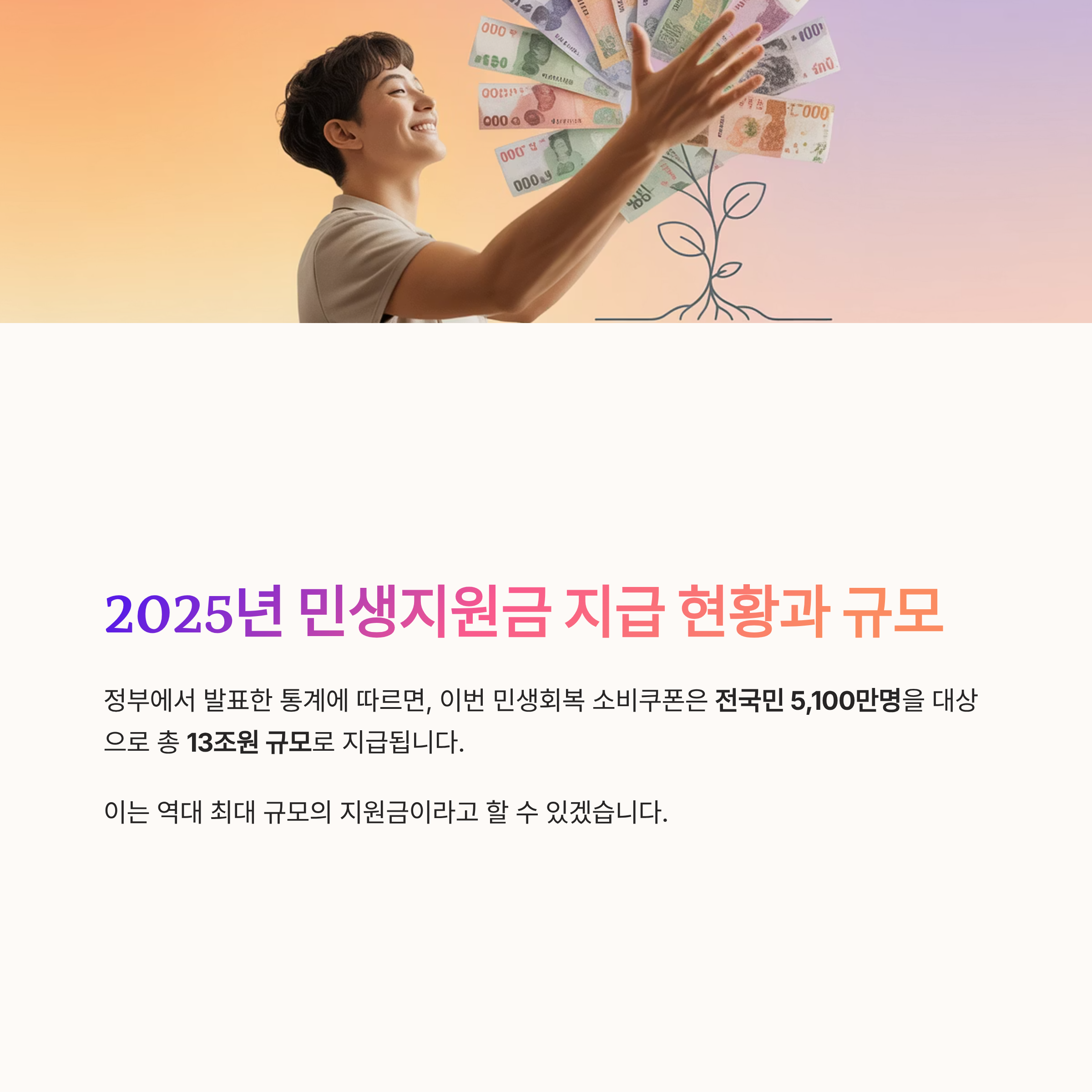 정부에서 발표한 통계에 따르면, 이번 민생회복 소비쿠폰은 전국민 5,100만명을 대상으로 총 13조원 규모로 지급됩니다.
