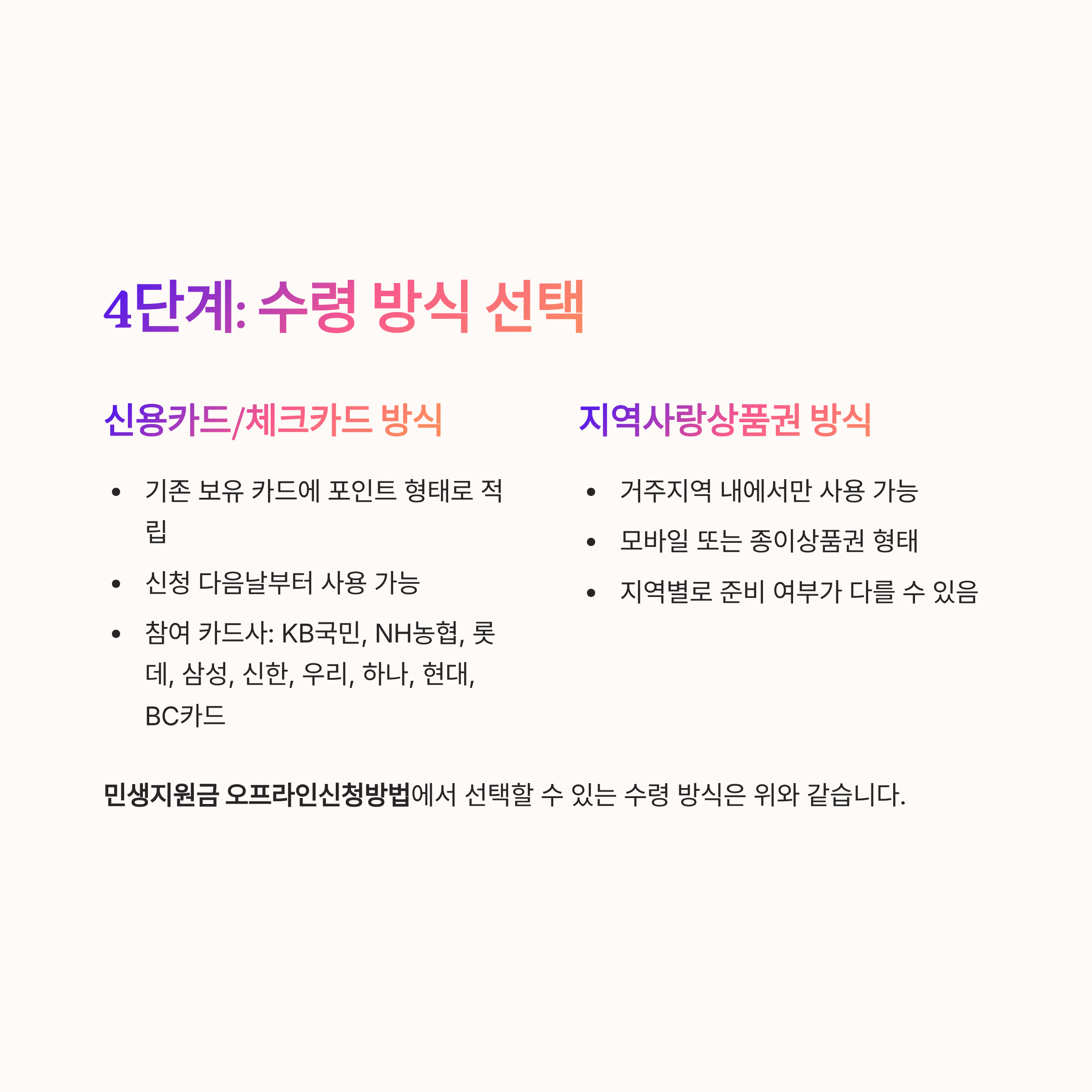 민생지원금 오프라인신청방법에서 선택할 수 있는 수령 방식은 다음과 같습니다: