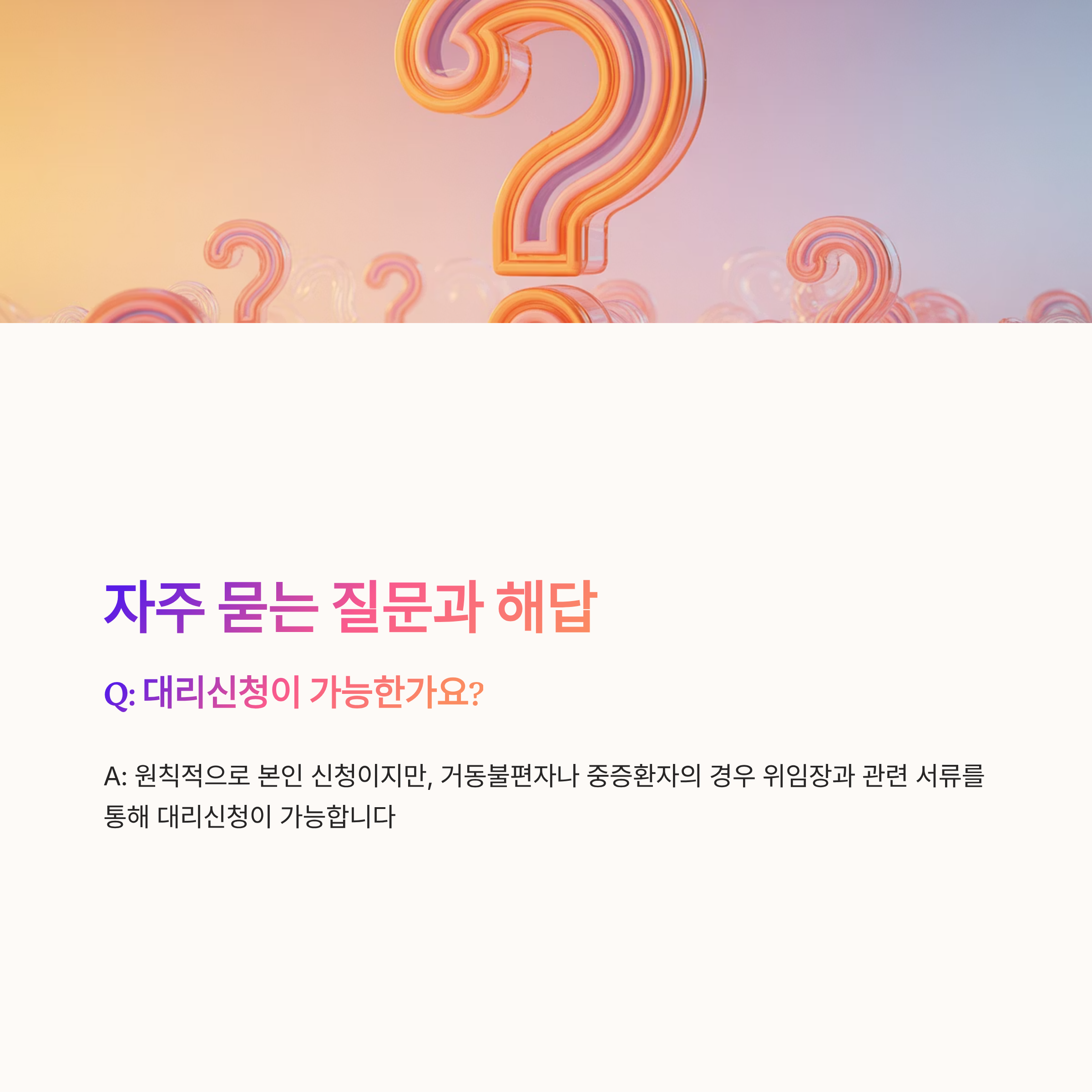 A: 원칙적으로 본인 신청이지만, 거동불편자나 중증환자의 경우 위임장과 관련 서류를 통해 대리신청이 가능합니다