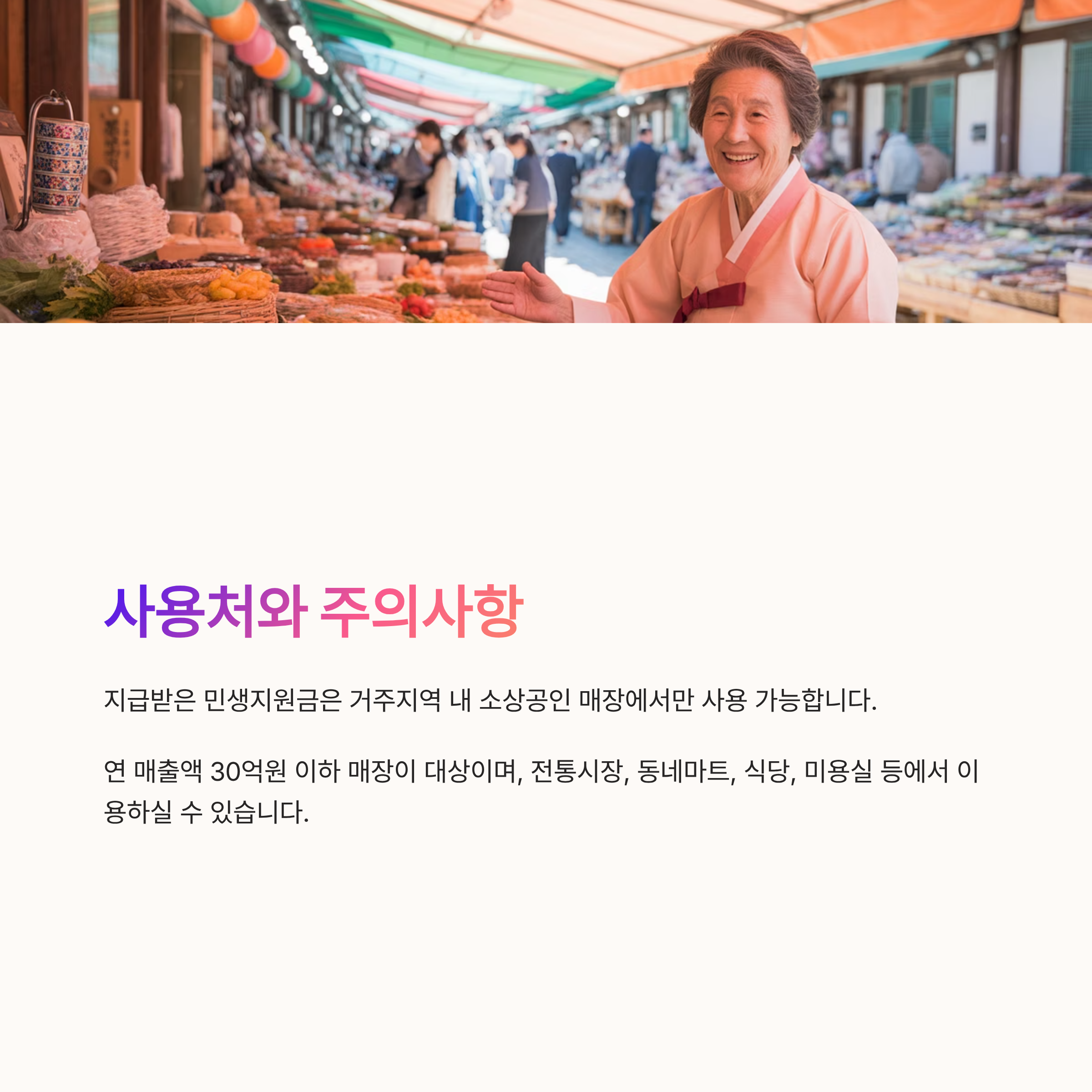 지급받은 민생지원금은 거주지역 내 소상공인 매장에서만 사용 가능합니다.