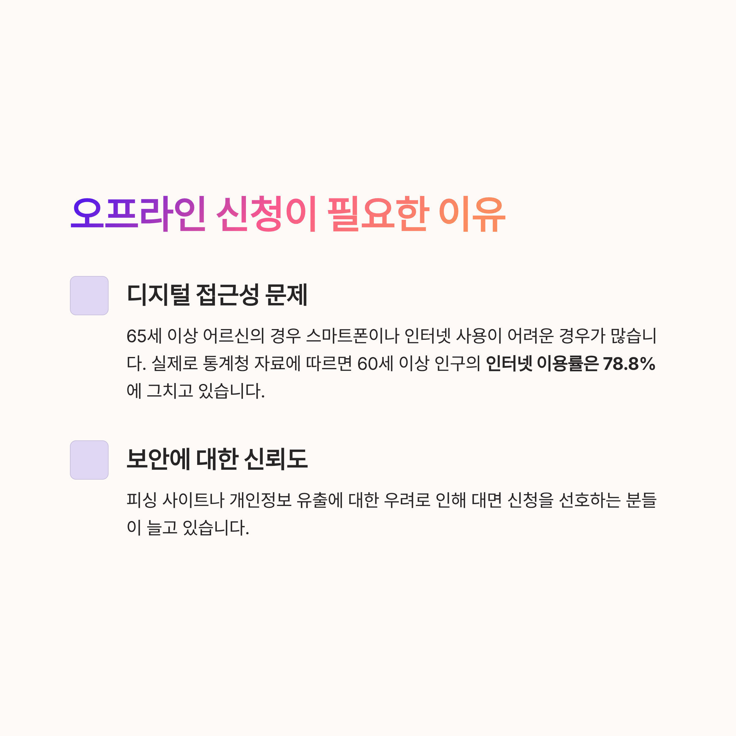 둘째, 보안에 대한 신뢰도입니다. 피싱 사이트나 개인정보 유출에 대한 우려로 인해 대면 신청을 선호하는 분들이 늘고 있습니다.