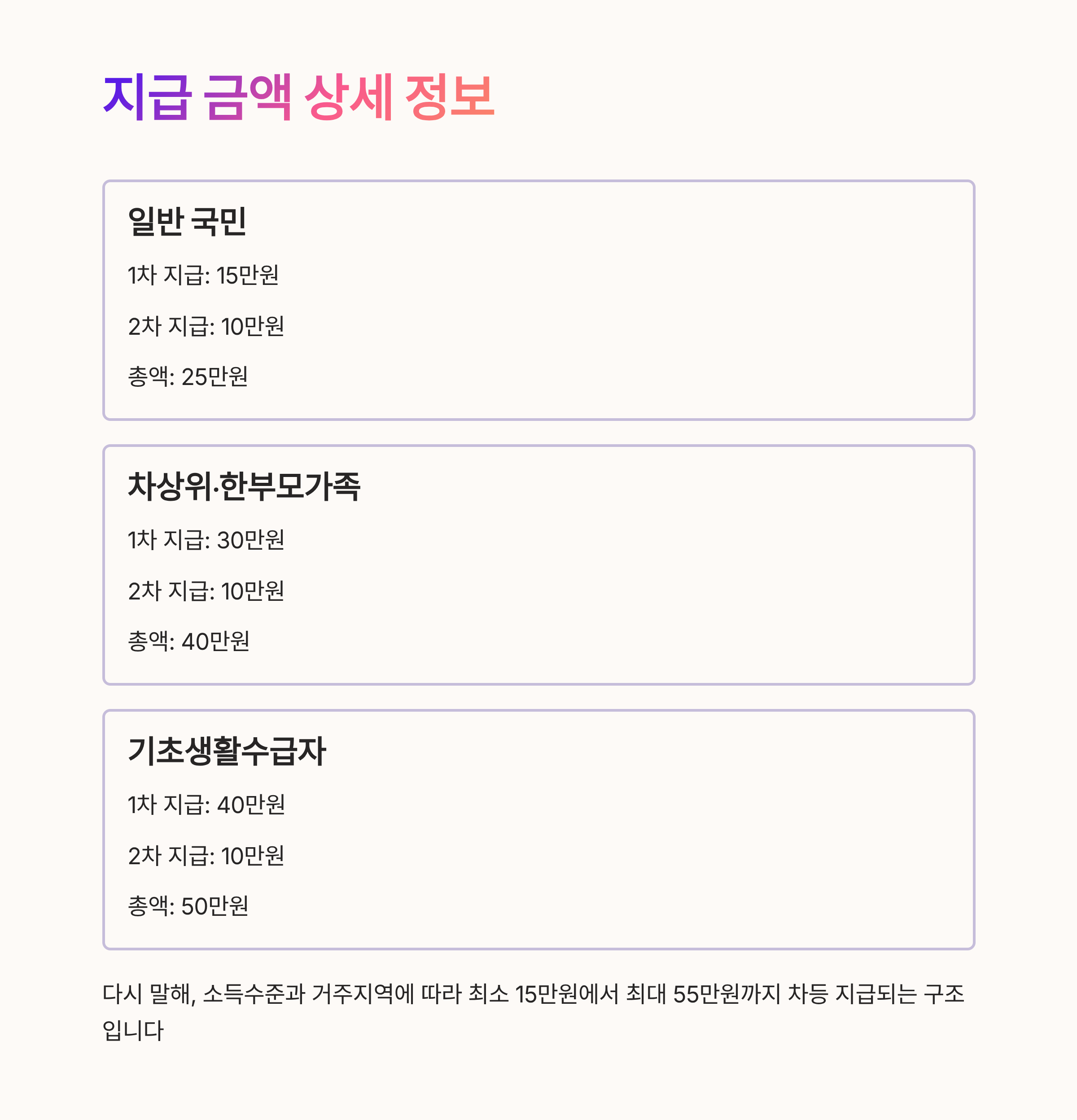 다시 말해, 소득수준과 거주지역에 따라 최소 15만원에서 최대 55만원까지 차등 지급되는 구조입니다